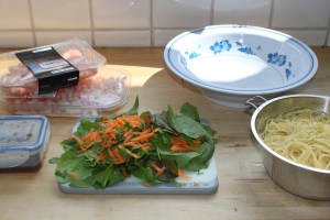 Lunch was great. Using the Waitrose recipe card, I made the dressing: 1 tbsp soy sauce, 1 tsp Nam Pla fish sauce, juice of 1 lime and 1 tsp clear honey. I cooked and drained the noodles and then stirred through the dressing. I then added the prawns, grated carrots and a handful of green leaves from the garden (spinach, beetroot tops, corn salad and rocket). It was delicious and very low in points.