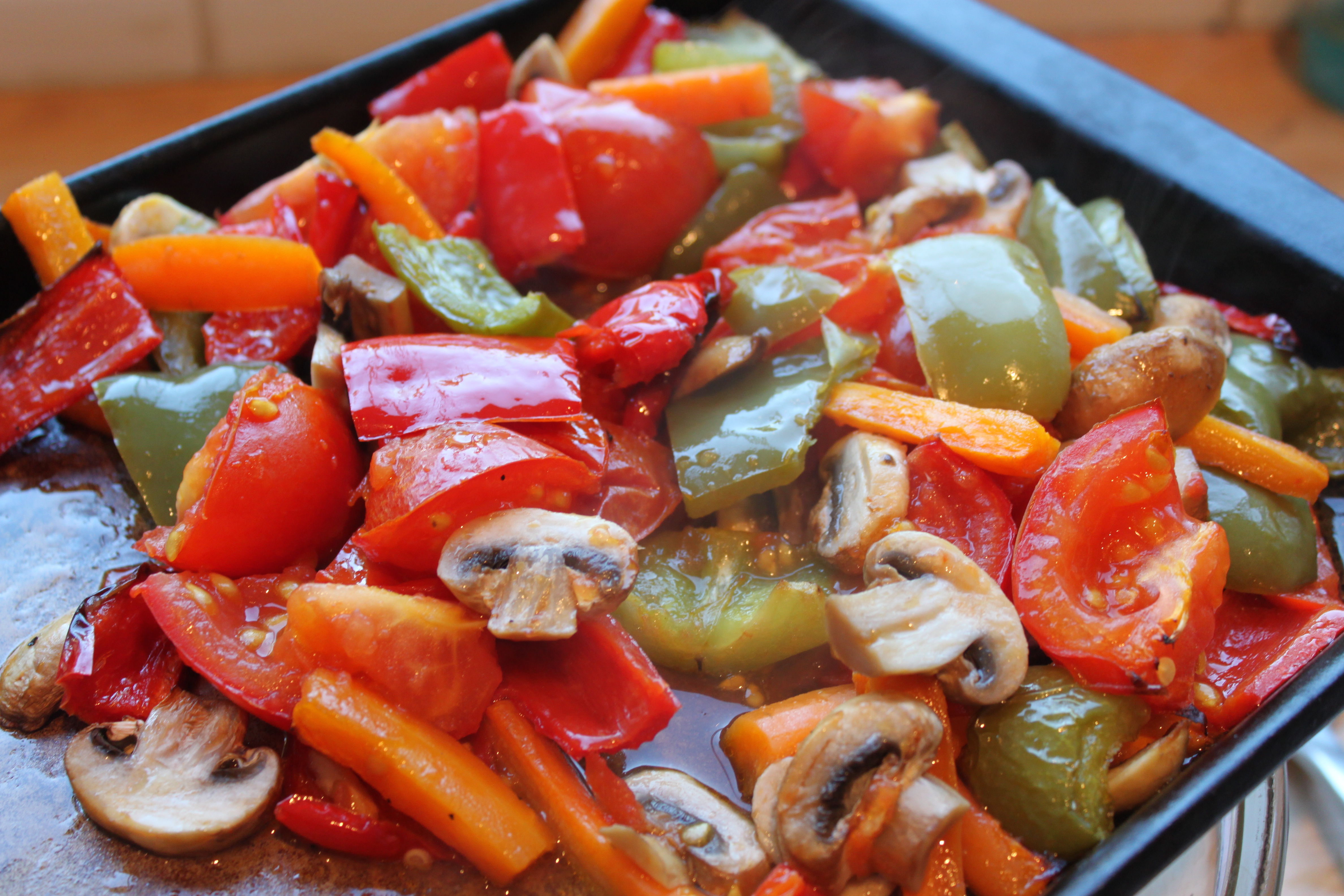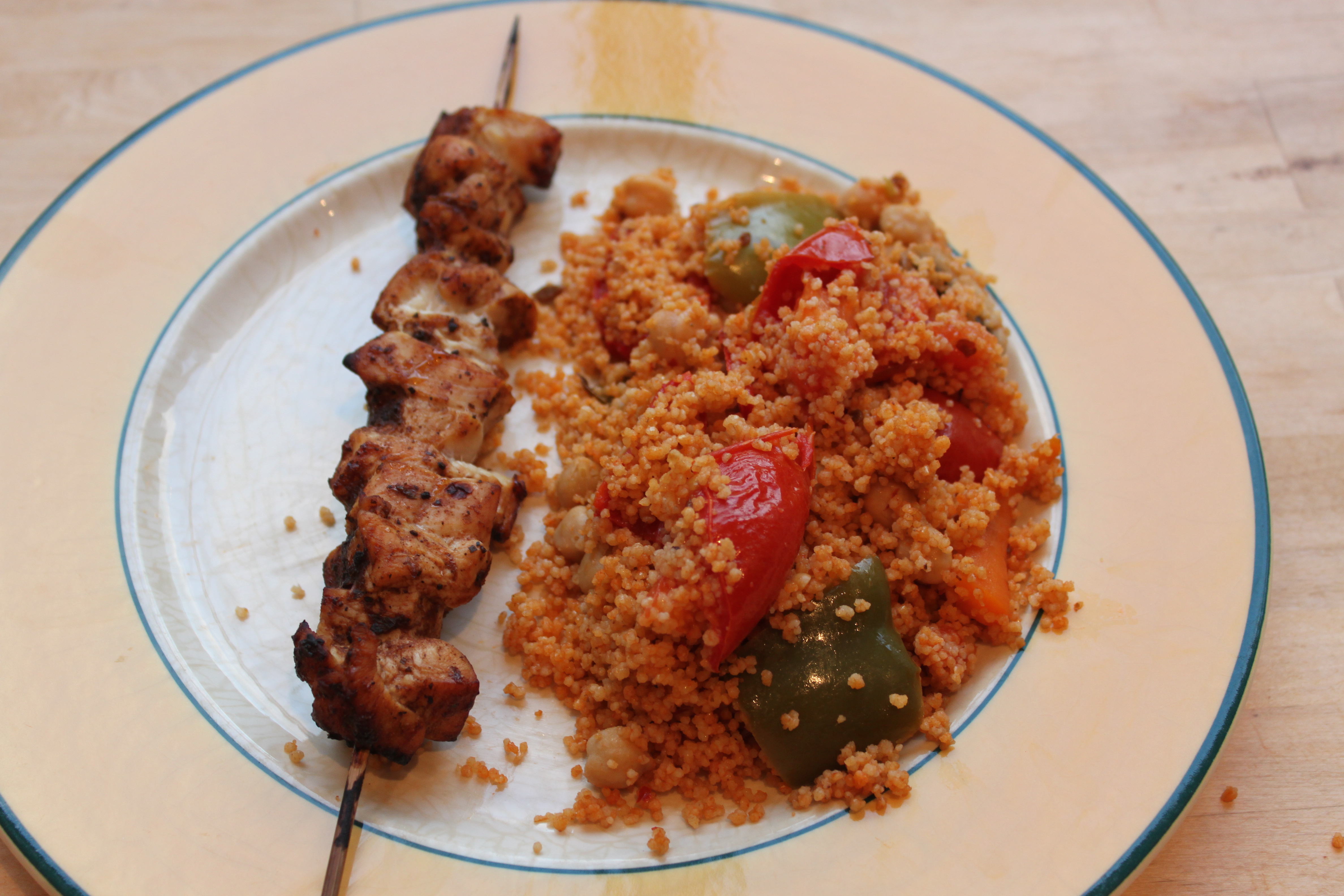 I chopped up peppers, carrots, mushrooms and tomatoes. Roasted them in the oven with a little bit of rapeseed oil. The couscous and harissa paste was mixed with vegetable stock and left to fluff up (took about 10 minutes). I threaded some chicken on to skewers and rubbed Jerk seasoning on them and then placed them under the grill. I mixed the roasted veggies in with the couscous and hey presto, supper was ready.