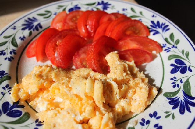I had 2 scrambled eggs with fresh tomatoes for breakfast.