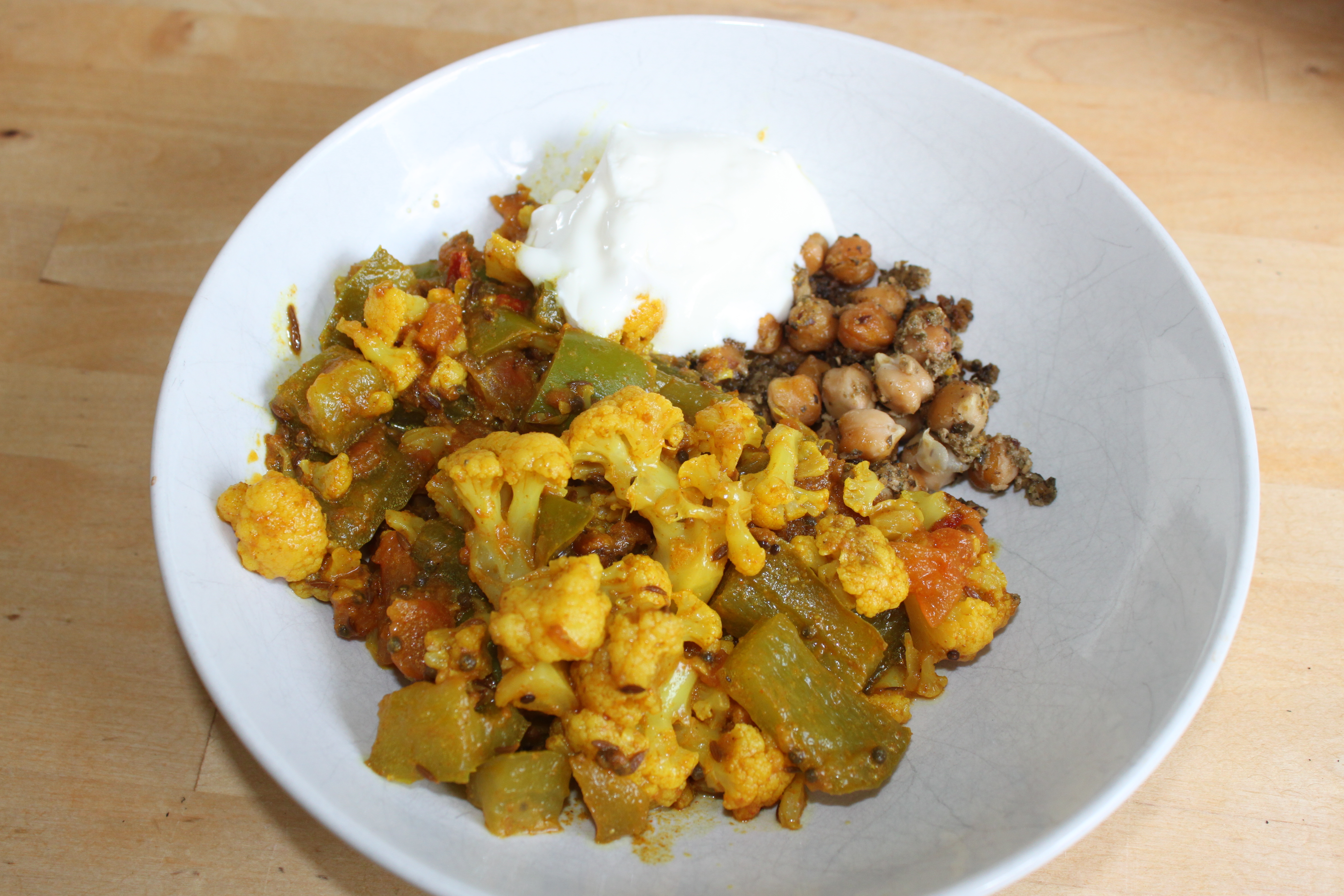 I was in the mood for a curry for lunch and I wanted to eat lots of vegetables. I had bought a cauliflower in the morning from a local farm shop so that was the centrepiece of the curry. I also had some chickpeas and some pesto in the fridge that needed eating up. So I made 2 dishes; one very easy and one quite easy but more time-consuming.