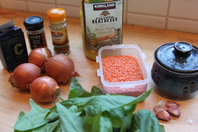 I fancied a dal as I am not fancying meat today. I have loads of spinach in the garden and one of my regular recipes, that is always delicious, is Rose Elliot’s Spinach Dal in ‘The Classic Vegetarian Cookbook’. This is a great book for a less experienced cook as it has lots of step by step preparation and cookery techniques. And some great photos.