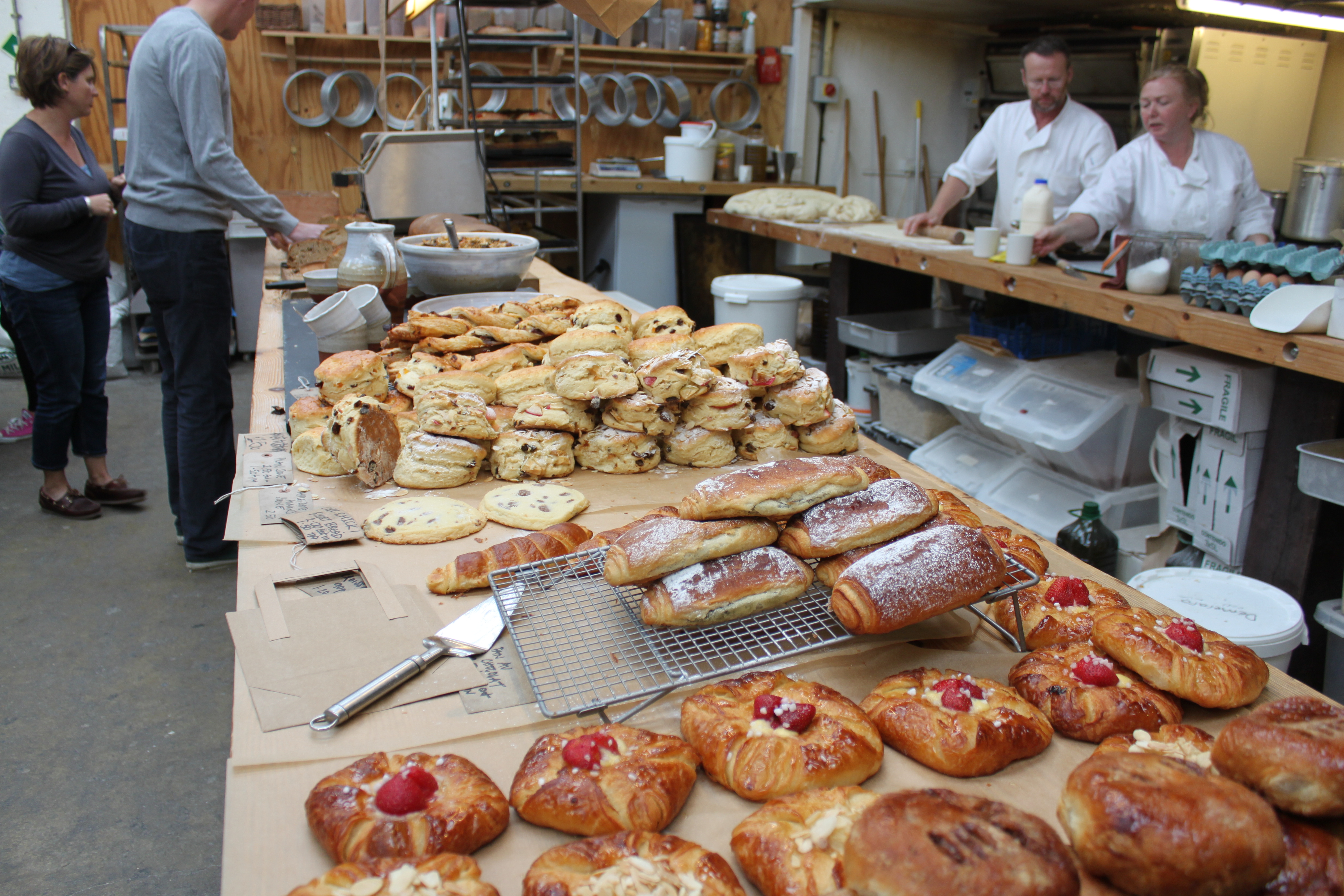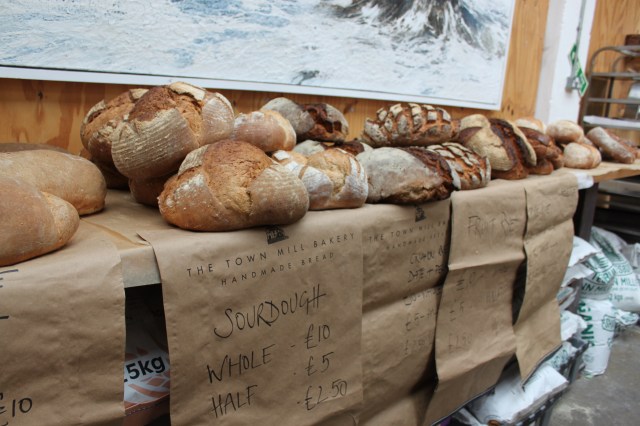 So on to my lovely weekend in Devon. We went to Murphy Manor and checked out all the improvements Lucy and Trevor have made to their house in Lyme. Leaving Trevor to his decorating and Olvia with a play date, we took Lucy and Harry to one of my favourite eateries in the world, The Town Mill Bakery in Lyme Regis, Dorset. The bread and cakes are handmade in front of you. It is self service and you sit on benches at long tables. Everyone sits together and passes big bowls of butter, jam and sugar and jugs of milk up and down. Actually, if you like silver cutlery and crisp white tablecloths and you hate sharing space with other people this may not be the place for you. But f you like brilliant baked goods and are happy to share your space with fellow foodies, then you would love it.