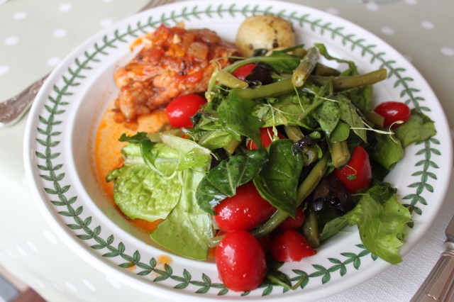On Monday I was home. Since it was weigh day, I was desperate to reduce the gain I was convinced I would have so I had porridge made with water. At the annual Sissinghurst village fete I avoided the bbq’d burgers and sausages and had a bbq’d corn cob instead. Oh and a Pimms. But that was only because it raised money for the school and it had fruit and veggies in it.