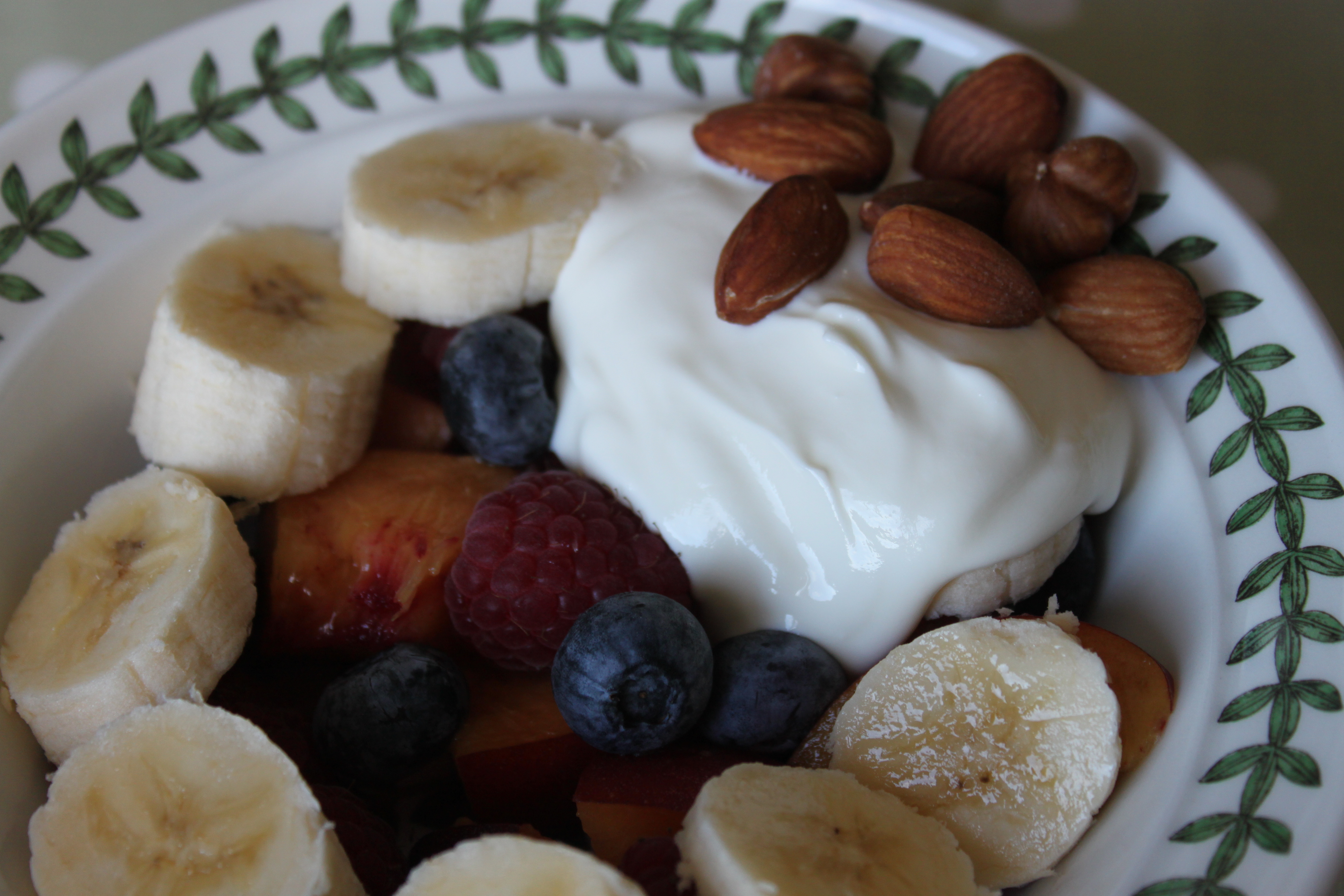 Highlights included a healthy breakfast: raspberries, blueberries, a nectarine, a small banana, a spoonful of natural probiotic yogurt and a few nuts.