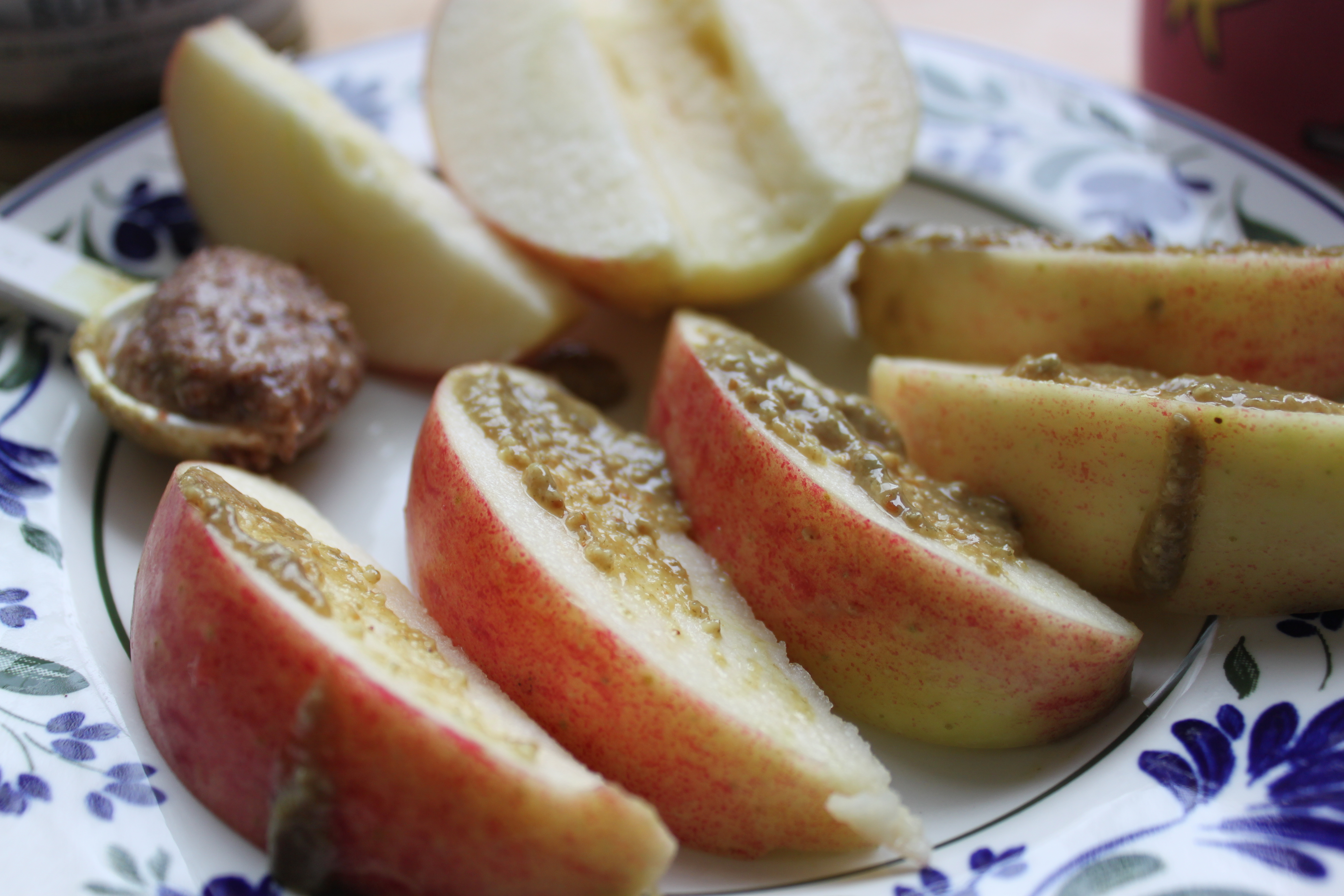 I had a healthy and very delicious snack. I chopped up one of the apples I picked yesterday and spread half with 1 tsp of pumpkin seed butter and half with 1 tsp of almond butter with cinnamon and coconut. Washed down with a cup of tea it was very tasty.