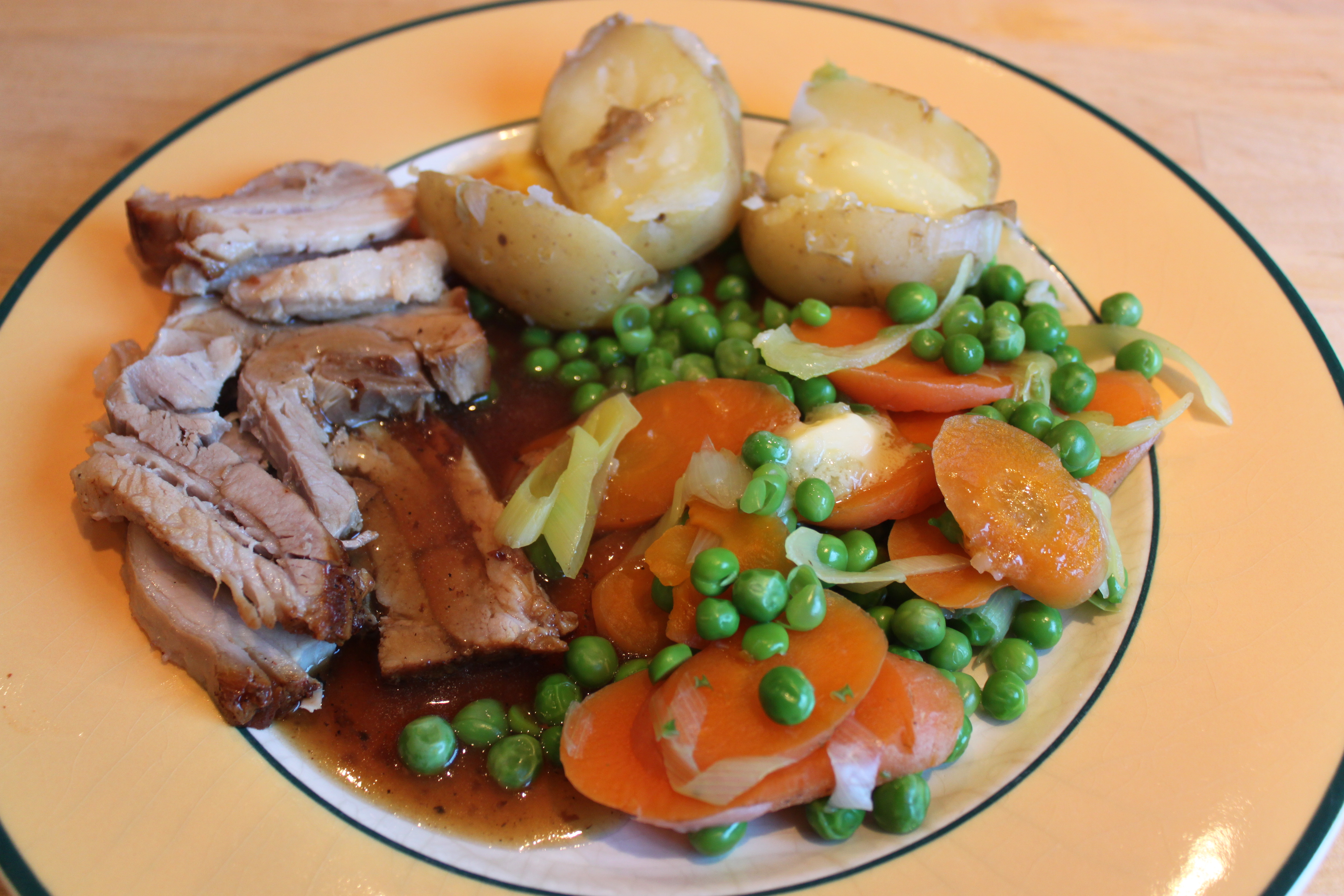 We haven’t been home on a Sunday for a while and we fancied a roast. We had slow roast pork belly, new potatoes, fresh podded peas (thank you Harvey for shelling them), leeks and carrots. With gravy and butter. Yummy. Slow roasting gives the fat a chance to drip out of the meat, leaving lean and tender and very tasty meat.