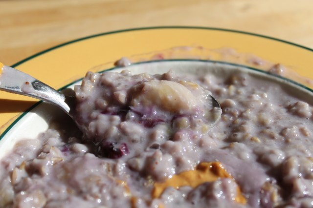 50 g Jumbo oats, 140 ml semi-skimmed milk, 1 tsp Chia seeds, 1 small banana, 1/2 punnett blueberries, 1 tbsp peanut butter.