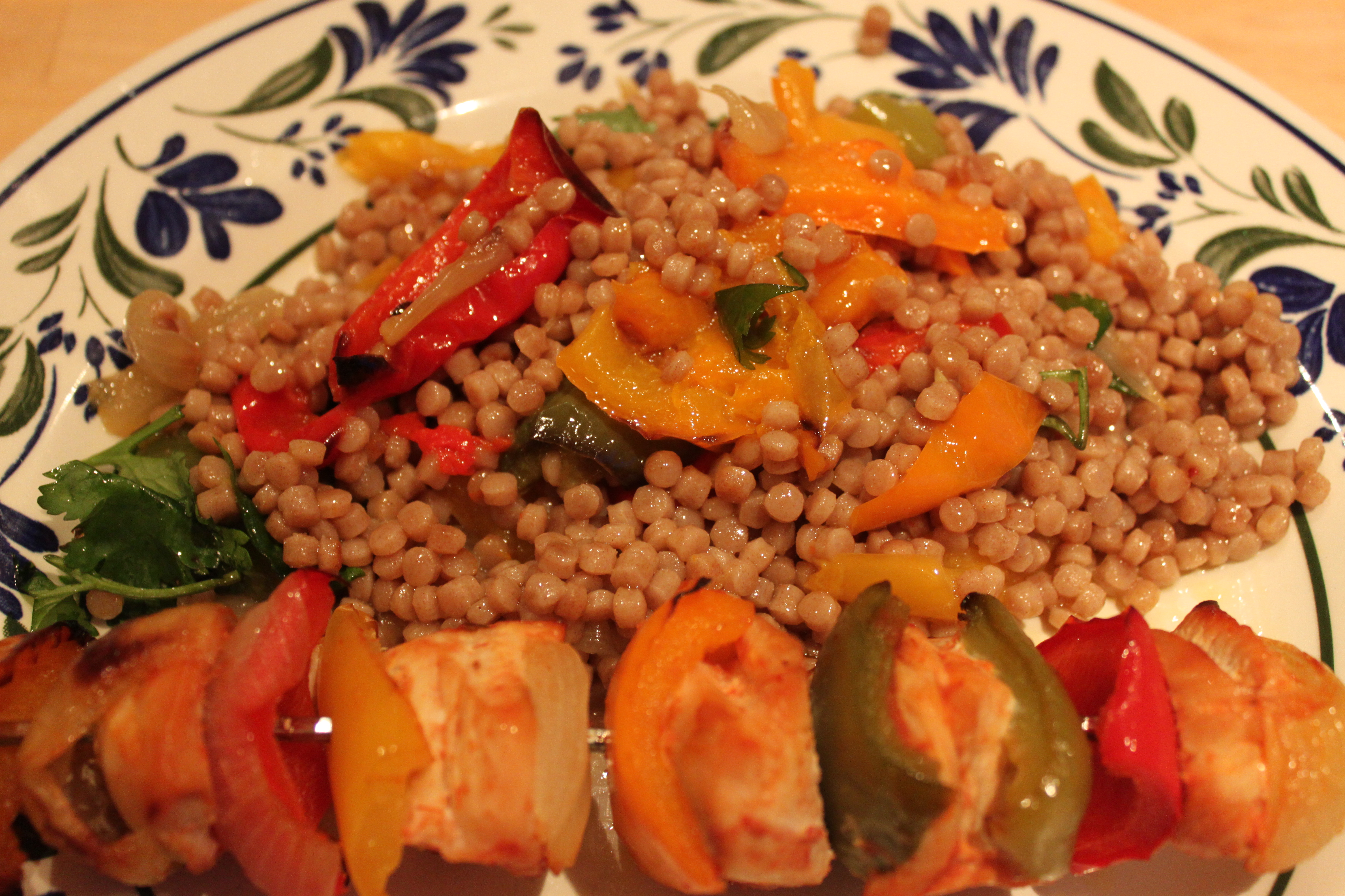 I decided to try something new tonight – some giant wholegrain couscous with roasted vegetables and chicken kebabs.