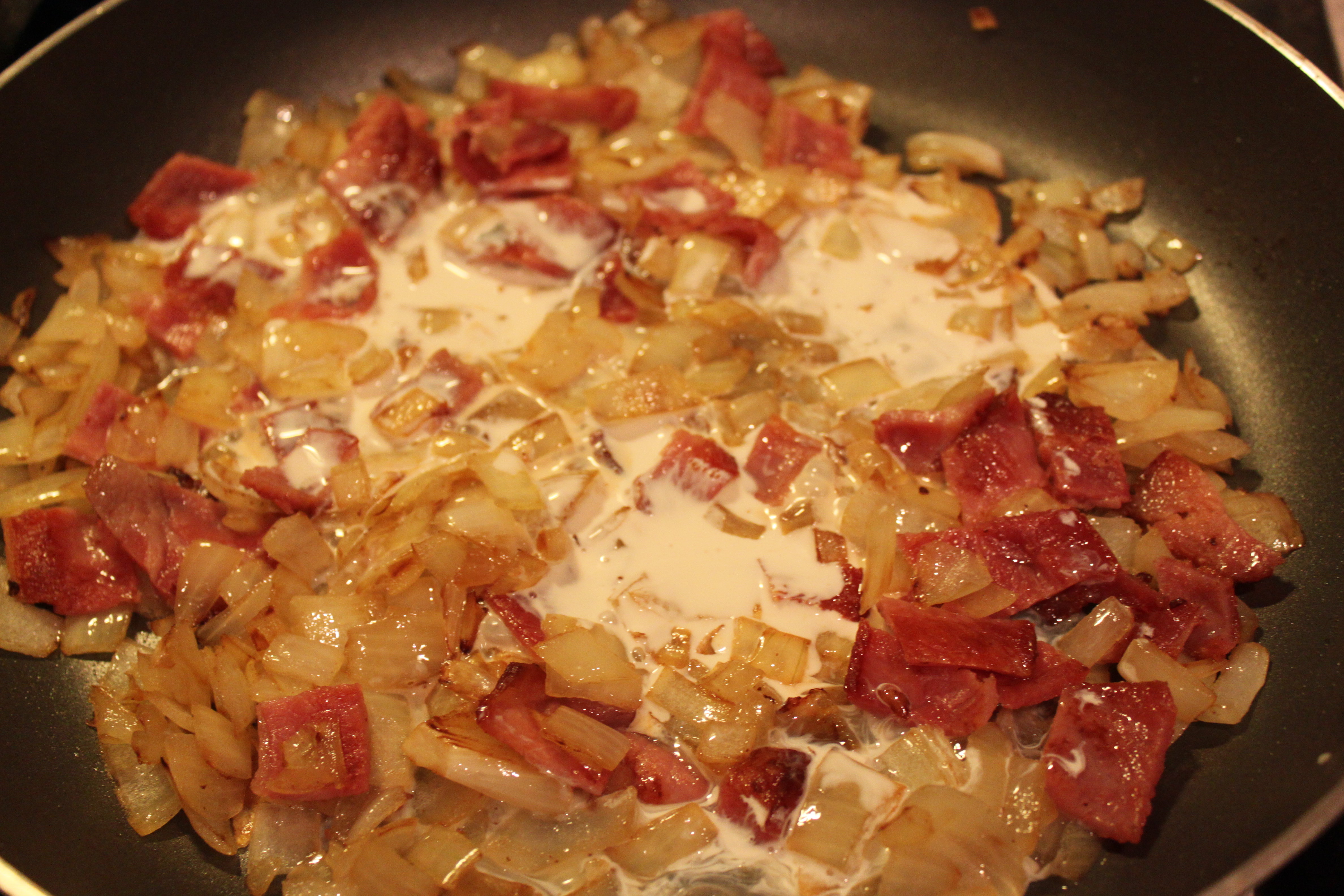 Adding the “cream” to the onions and bacon.  The only fat in this dish comes from the bacon which was lean and the cream but there is less fat in Alpro than real cream.