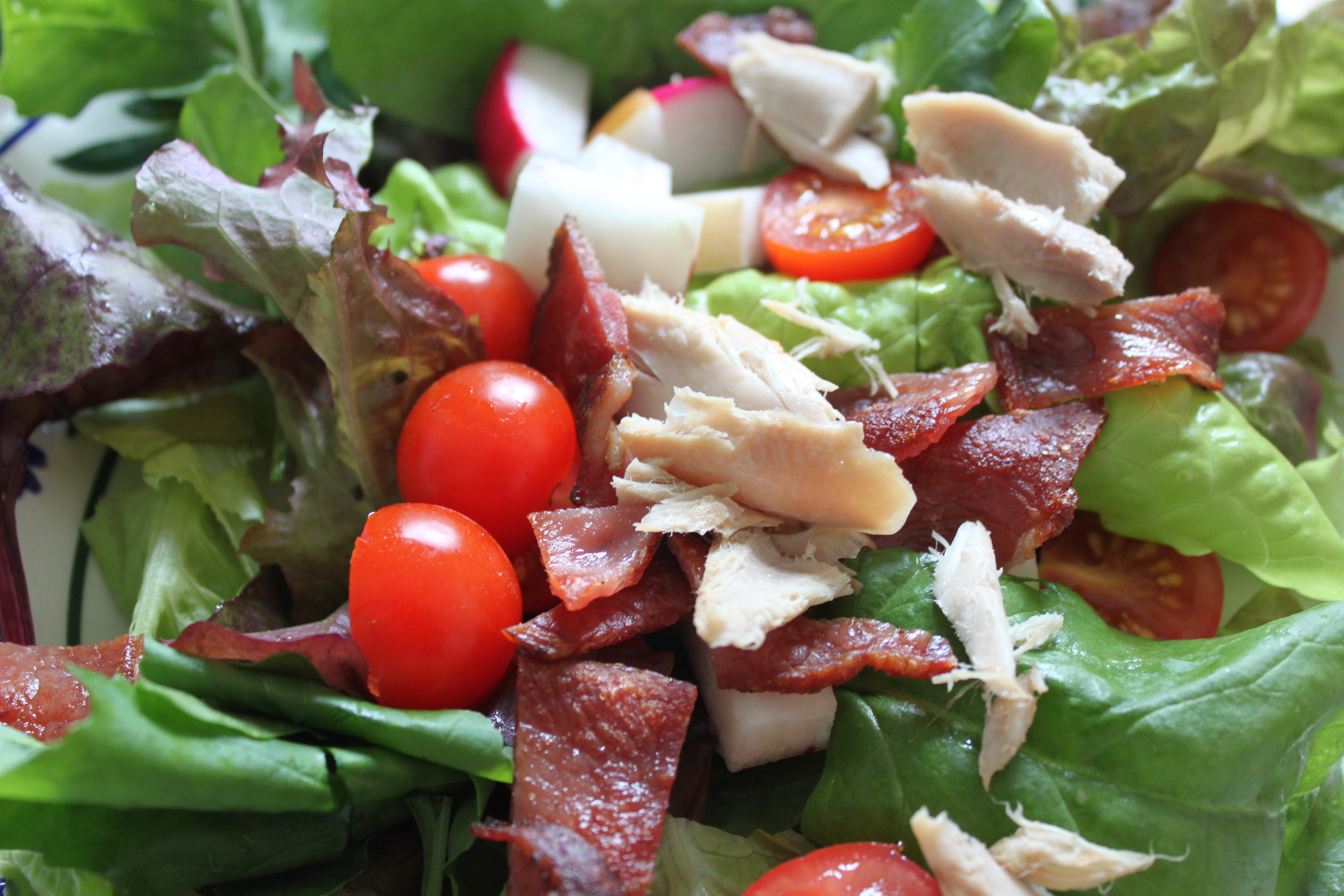 I had a really light lunch; salad leaves and radishes from the garden, 1 rasher of bacon, 1/2 a chicken drumstick and 1 tbsp salad cream.