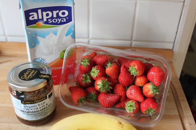 I bought some cheap strawberries yesterday which were only fit for blending so a smoothie was on the breakfast menu: 1 banana, 1/2 punnett of strawberries, 140 ml soya milk and 1 tbsp chocolate and hempseed spread.