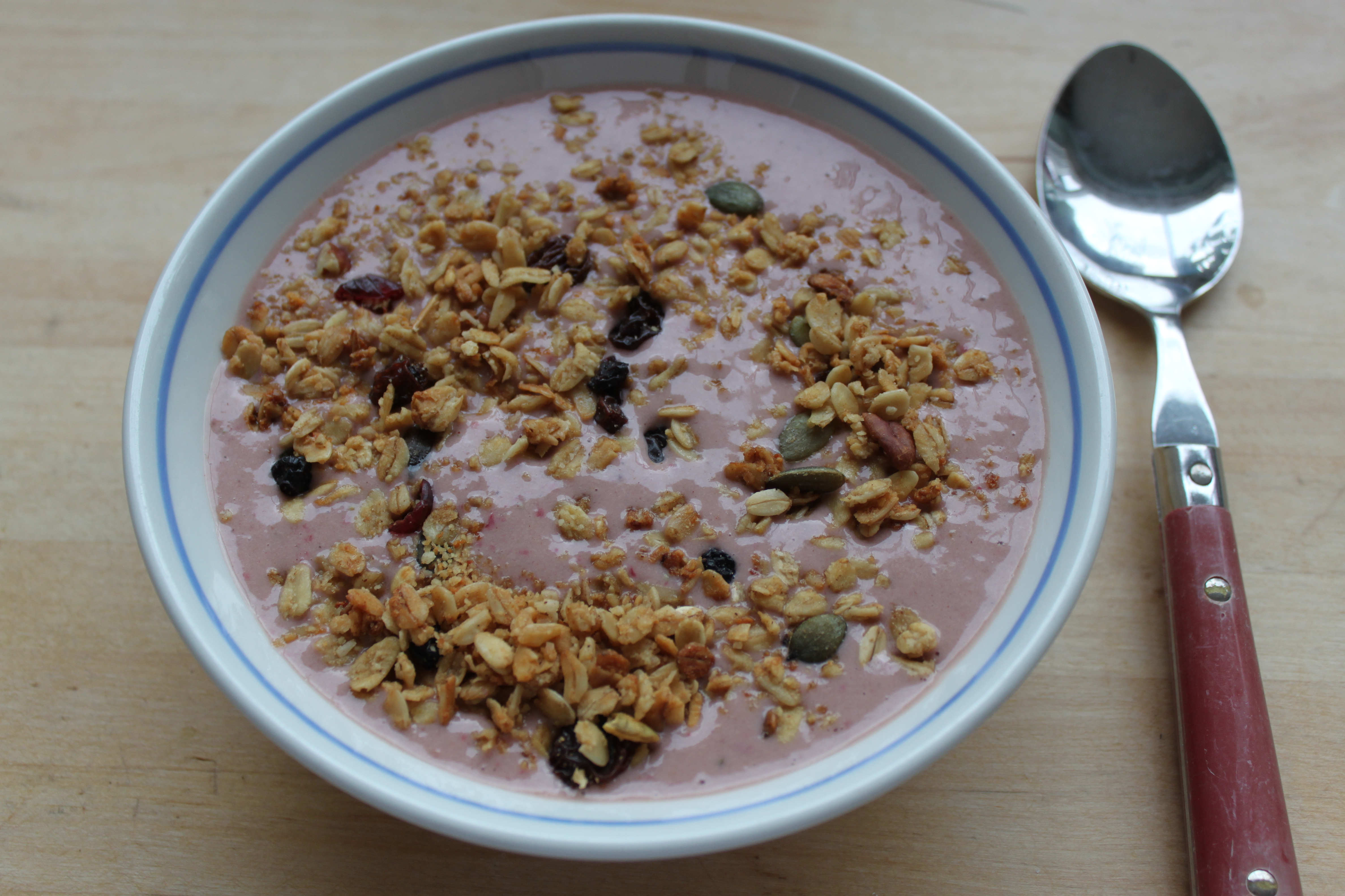 My little breakfast buddy wanted some smoothie too, as well as his bowl of cereal so I was down to a half portion which wouldn’t sustain me until lunch time. So I poured mine in to a bowl and added some granola. I needed fuel for tennis.
