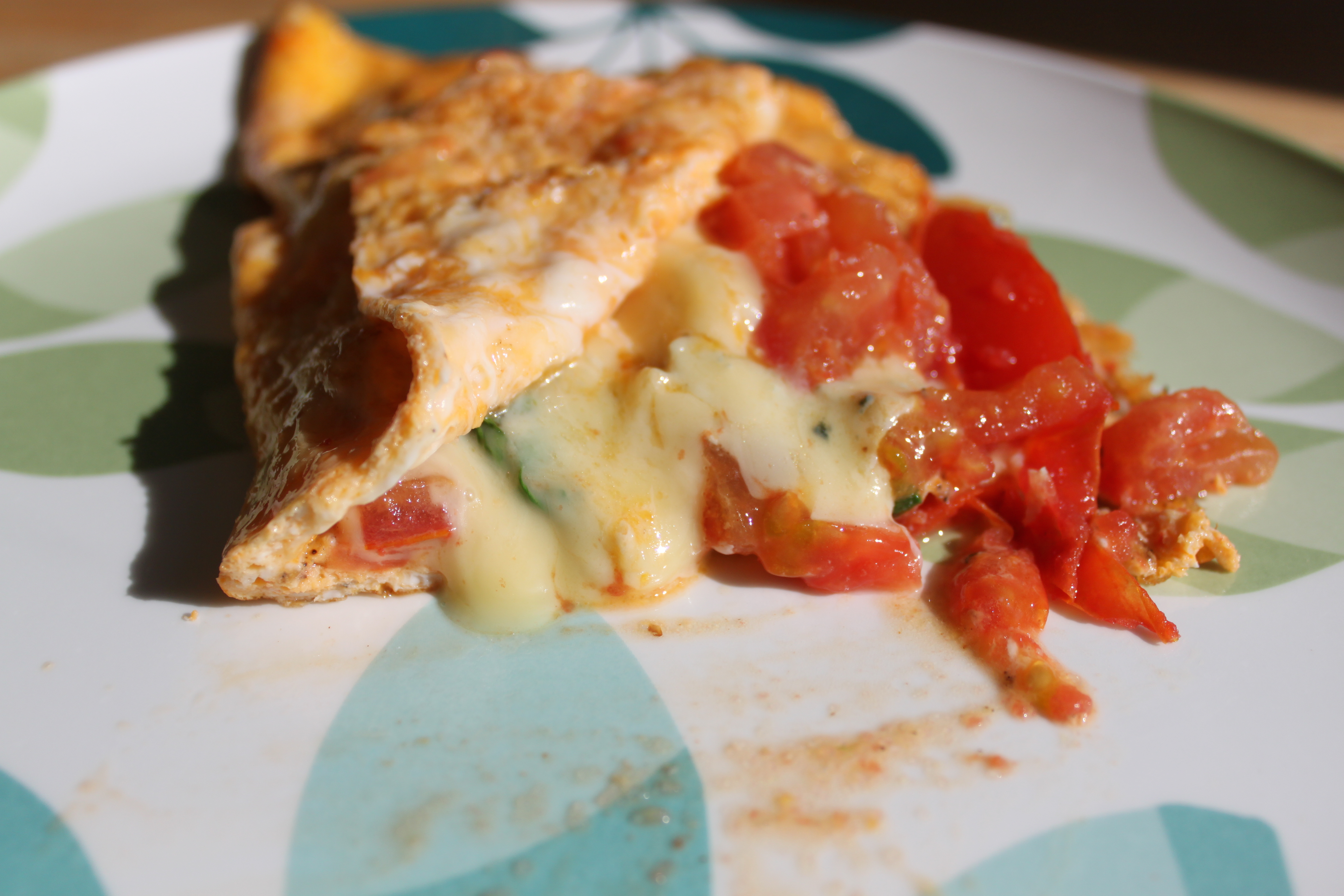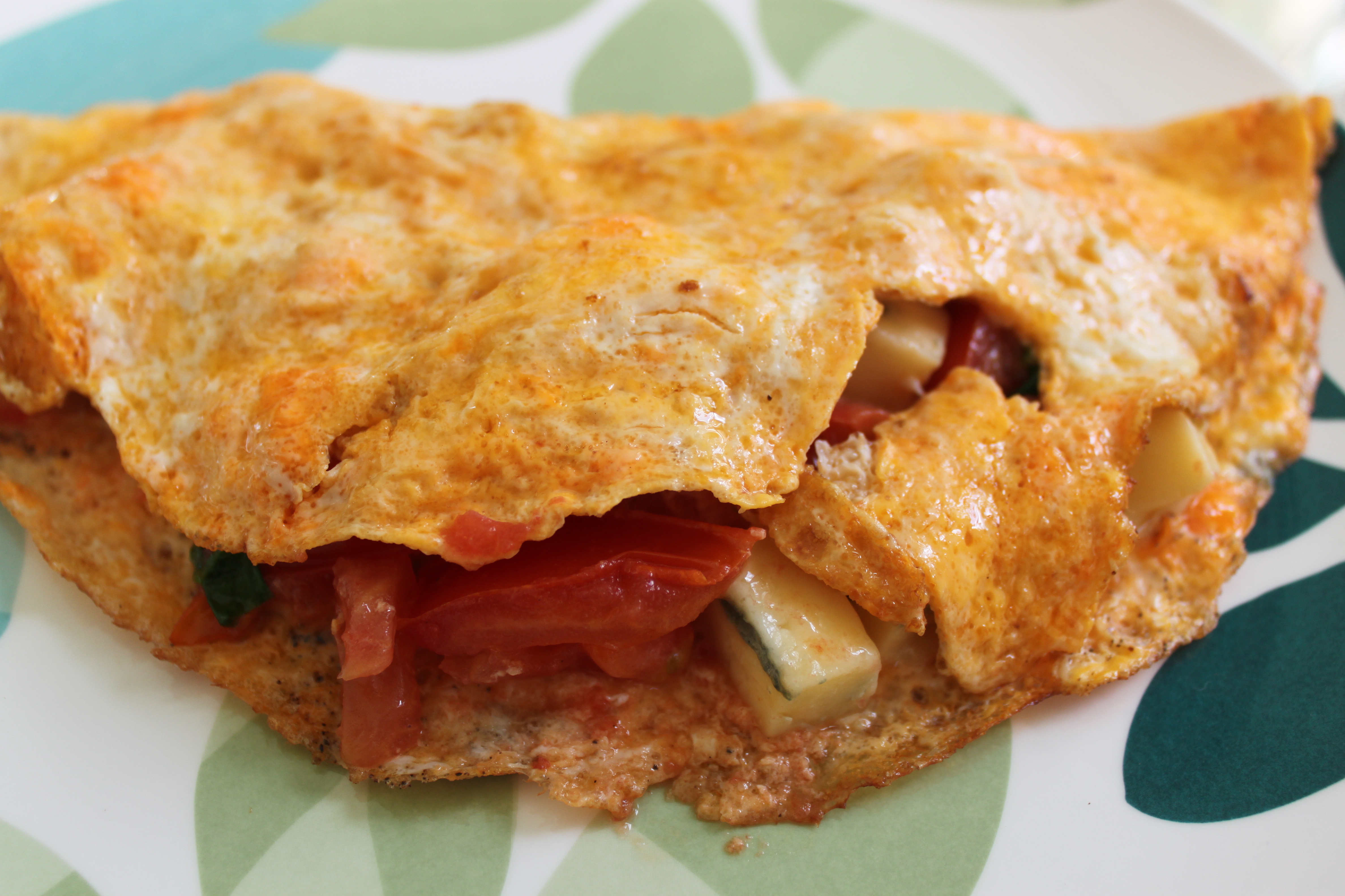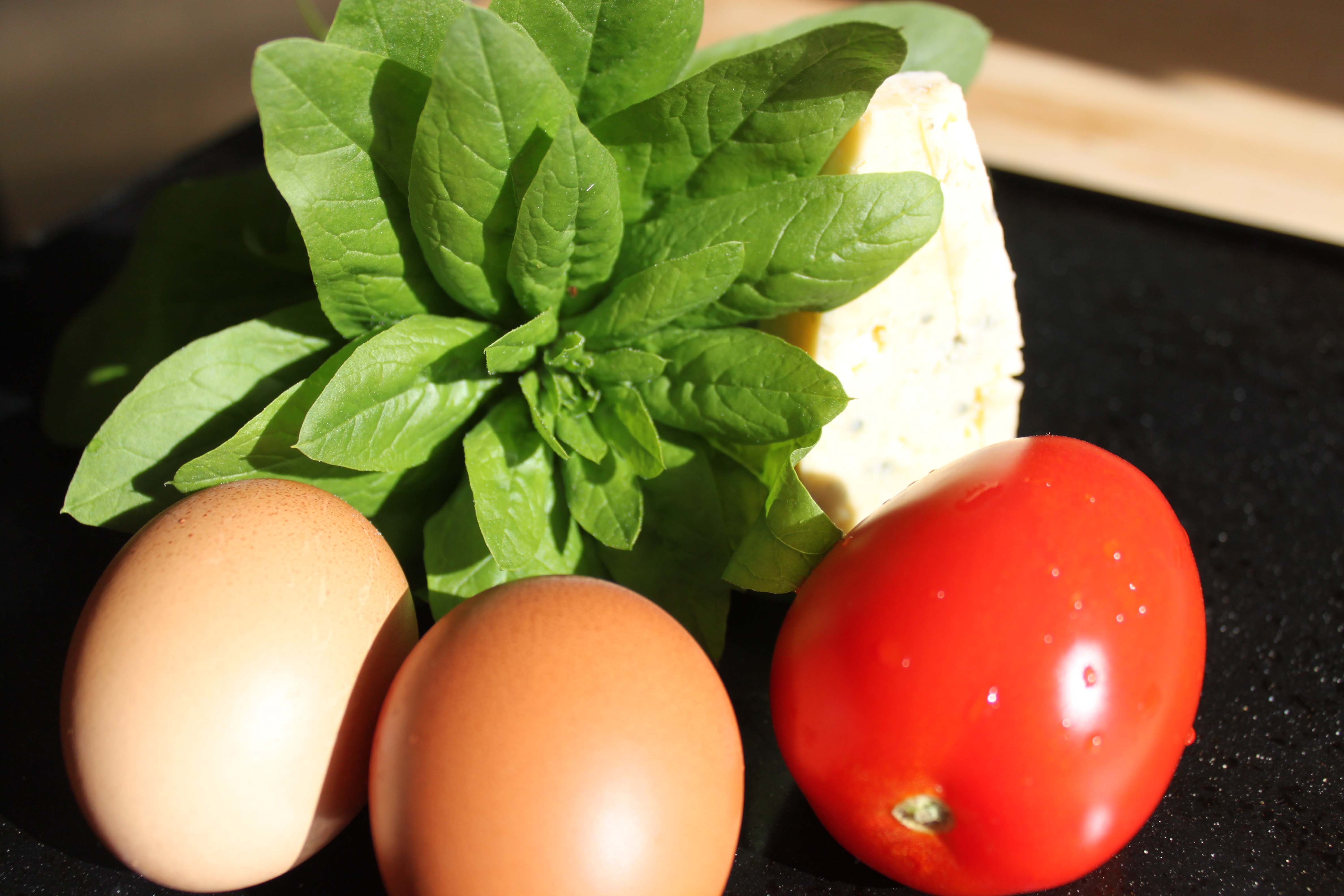 So for breakfast today I had a 2 egg omelette, with spinach from the garden, a ripe and juicy plum tomato and 50 g of Cashel Blue cheese. I greased the pan with butter. Not much as it is a non stick pan but enough to give me the butter flavour I wanted. It was probably a small teaspoon full.