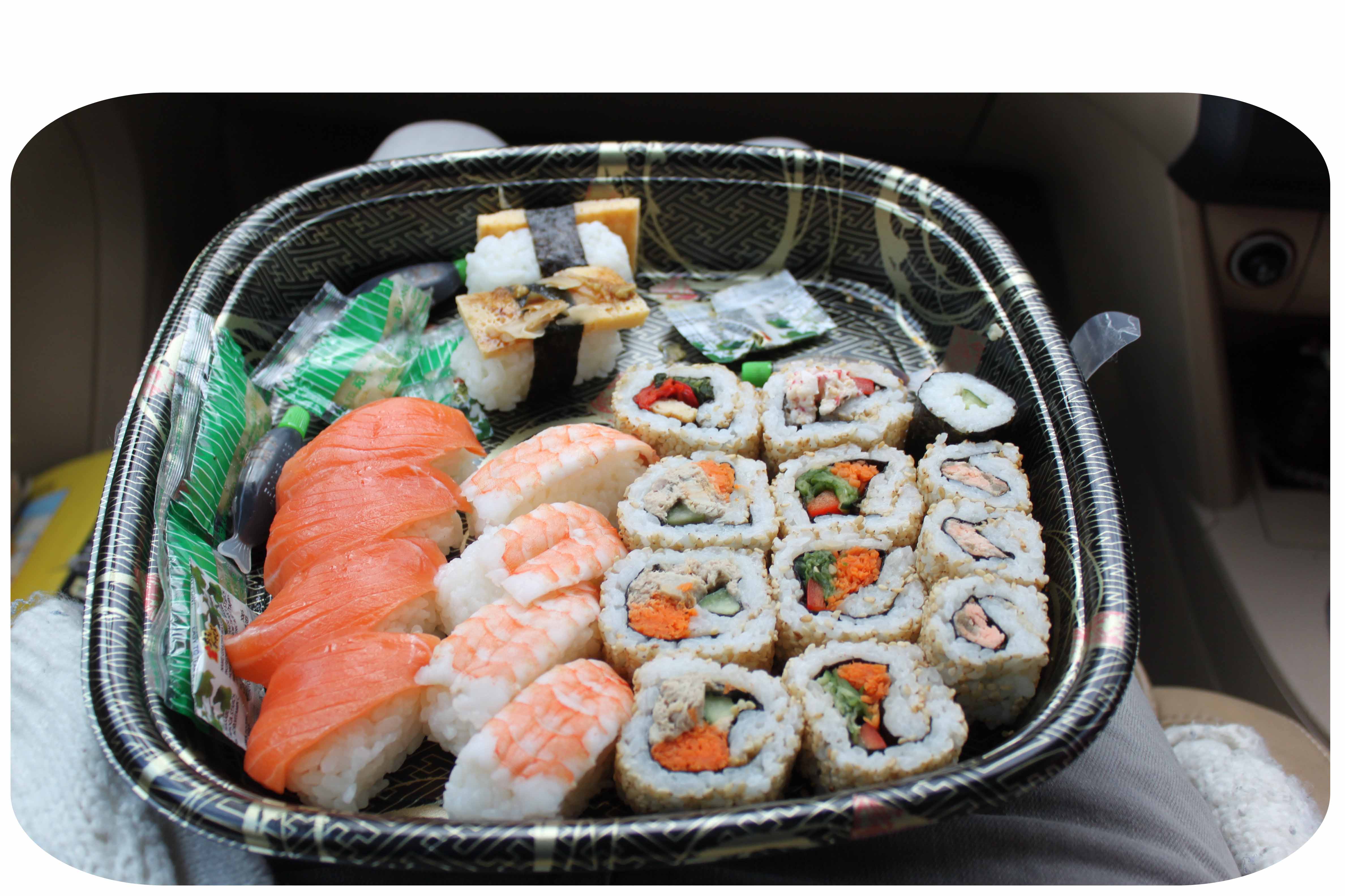 Lunch was some Sushi in the car on the way home. Once Lara had got the hang of how much wasabi I liked they were delicious. Her first attempt nearly killed me it was soooo hot! I was disappointed to see how many points/calories Sushi has so it will be saved as a special occasion treat in the future.