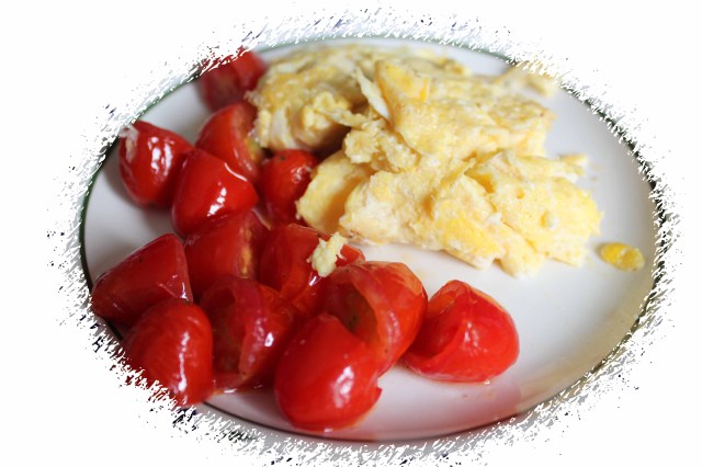 Breakfast was not the time to start a vegetable recipe though.  This morning’s fare was a scrambled egg with baby plum tomatoes.  Using a non stick saucepan, I melted 1 tsp of butter, cut the baby plum tomatoes in half and lightly warmed them through in the butter.  I put the tomatoes on our plates and scrambled the eggs in the butter left in the pan.  There was only enough egg to have one each but it was sufficient.  Only 4 WW points.