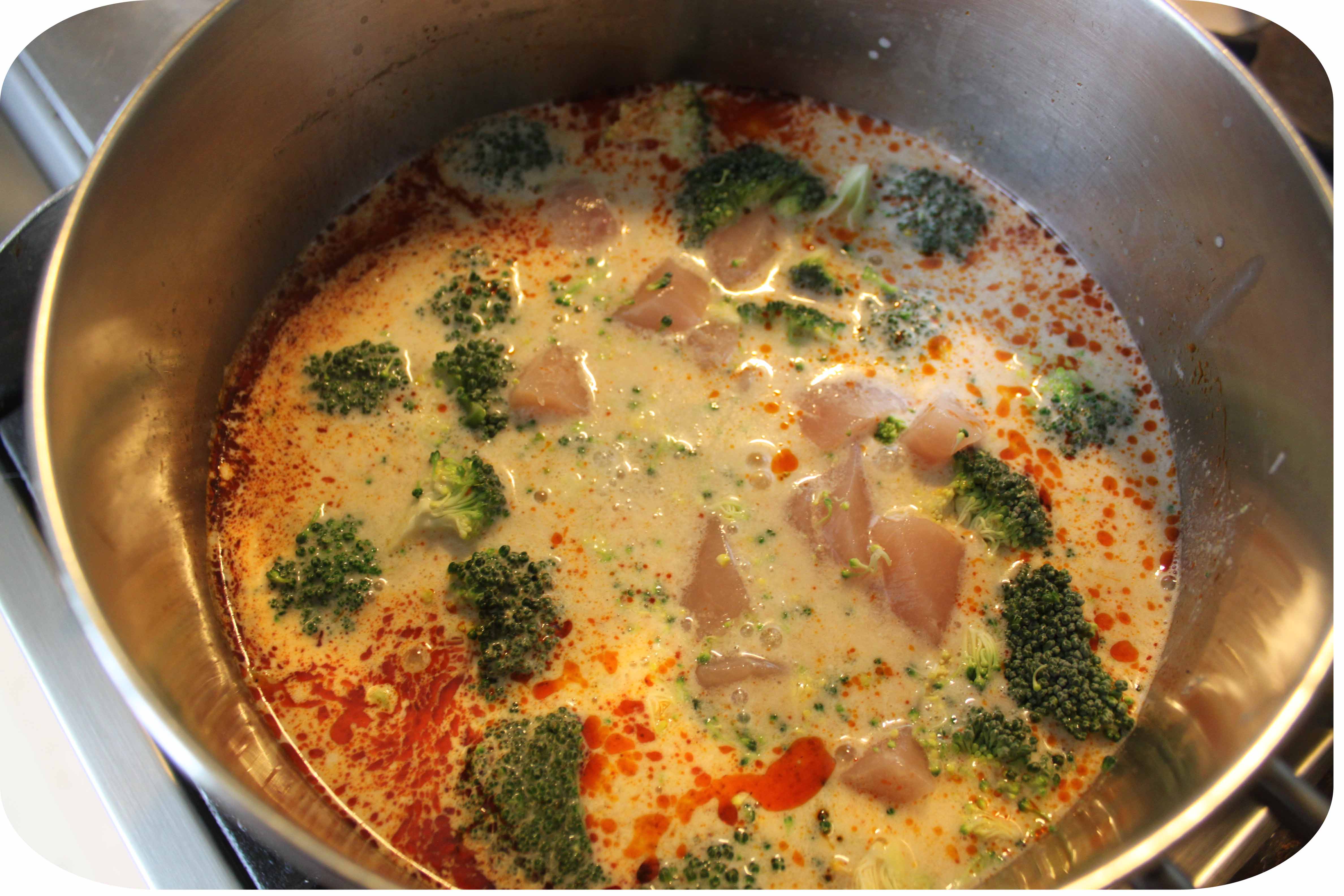 - Add the chicken and broccoli to the saucepan and simmer for 10 minutes.