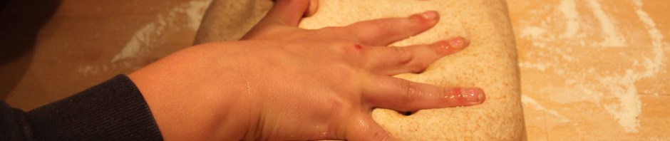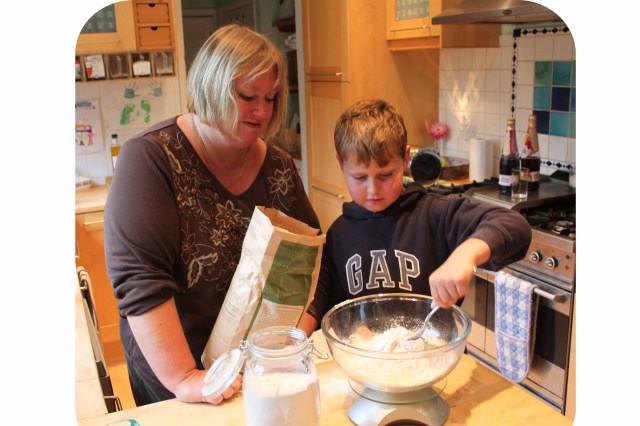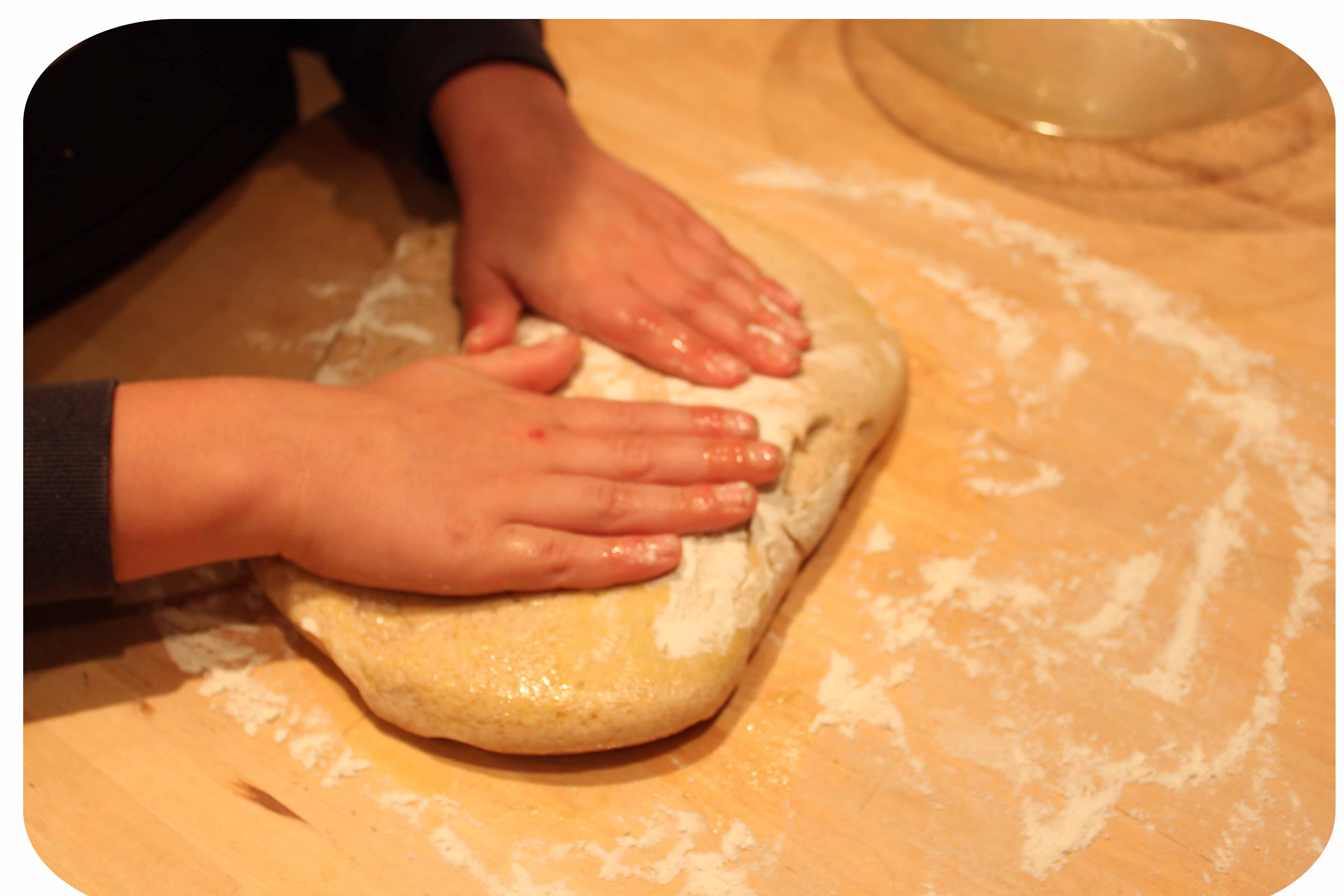 We were having a quiet day at home which we all needed after such a busy time recently. The left over Porotos Granados from last night was moved back from lunch today to supper. I made another recipe from ‘Veg everyday!’ with my little helper; Garlicky flatbreads. If your children are at all interested in cooking, making bread is an excellent recipe to make with them. Children love tactile activities and kneading bread dough is fun. The bonus for the rest of the family who have to eat the results of their kneading, is that they can’t really ruin it.