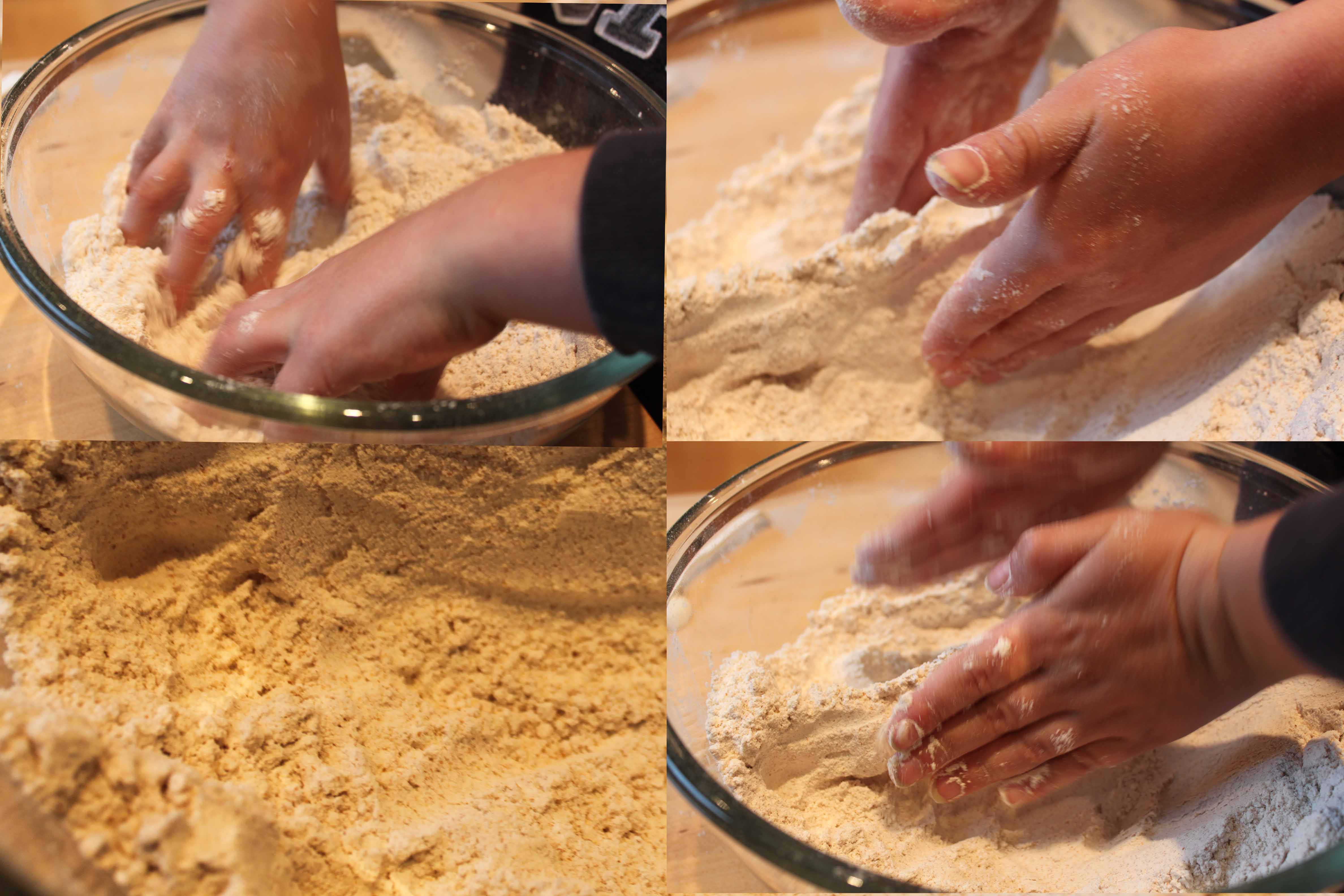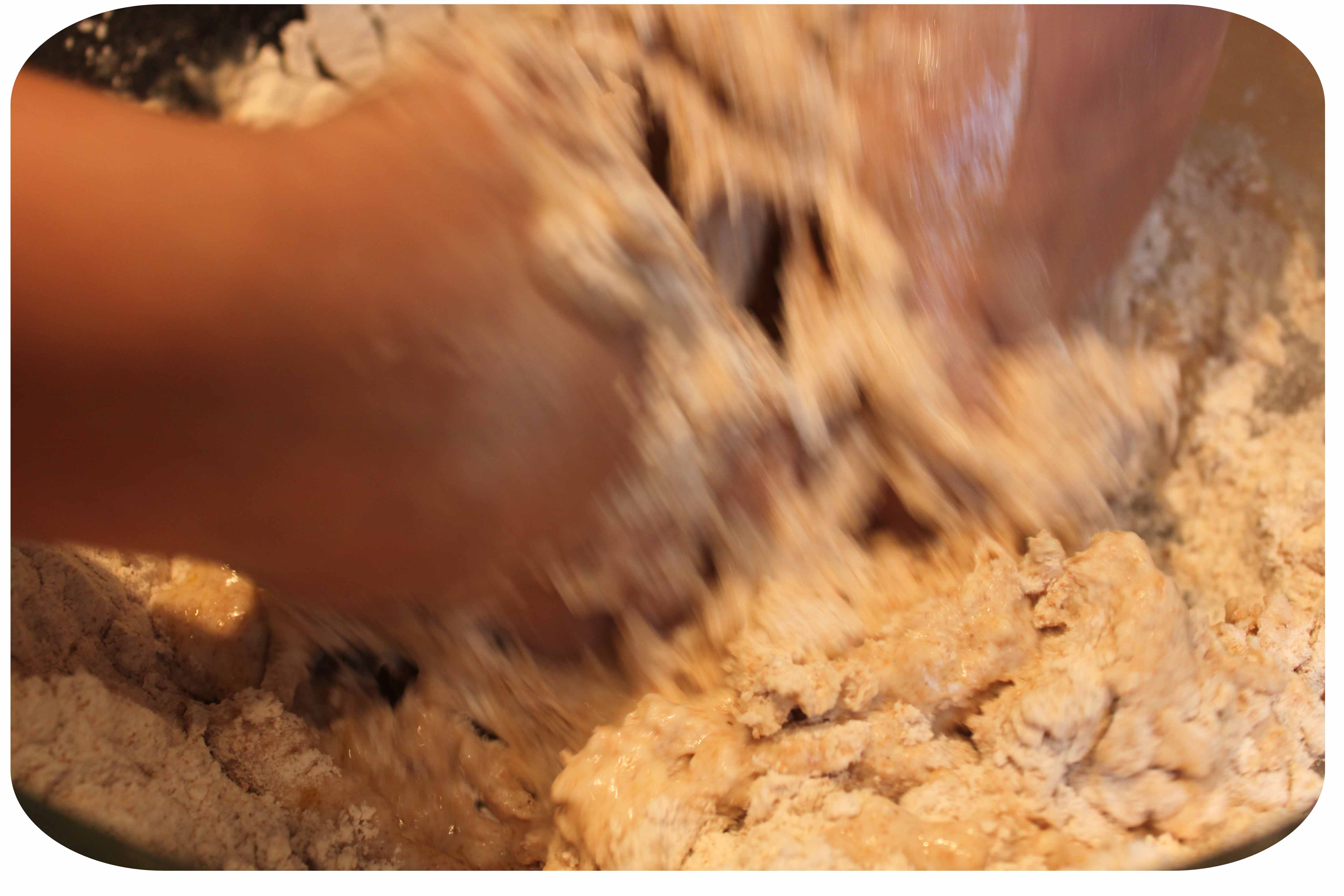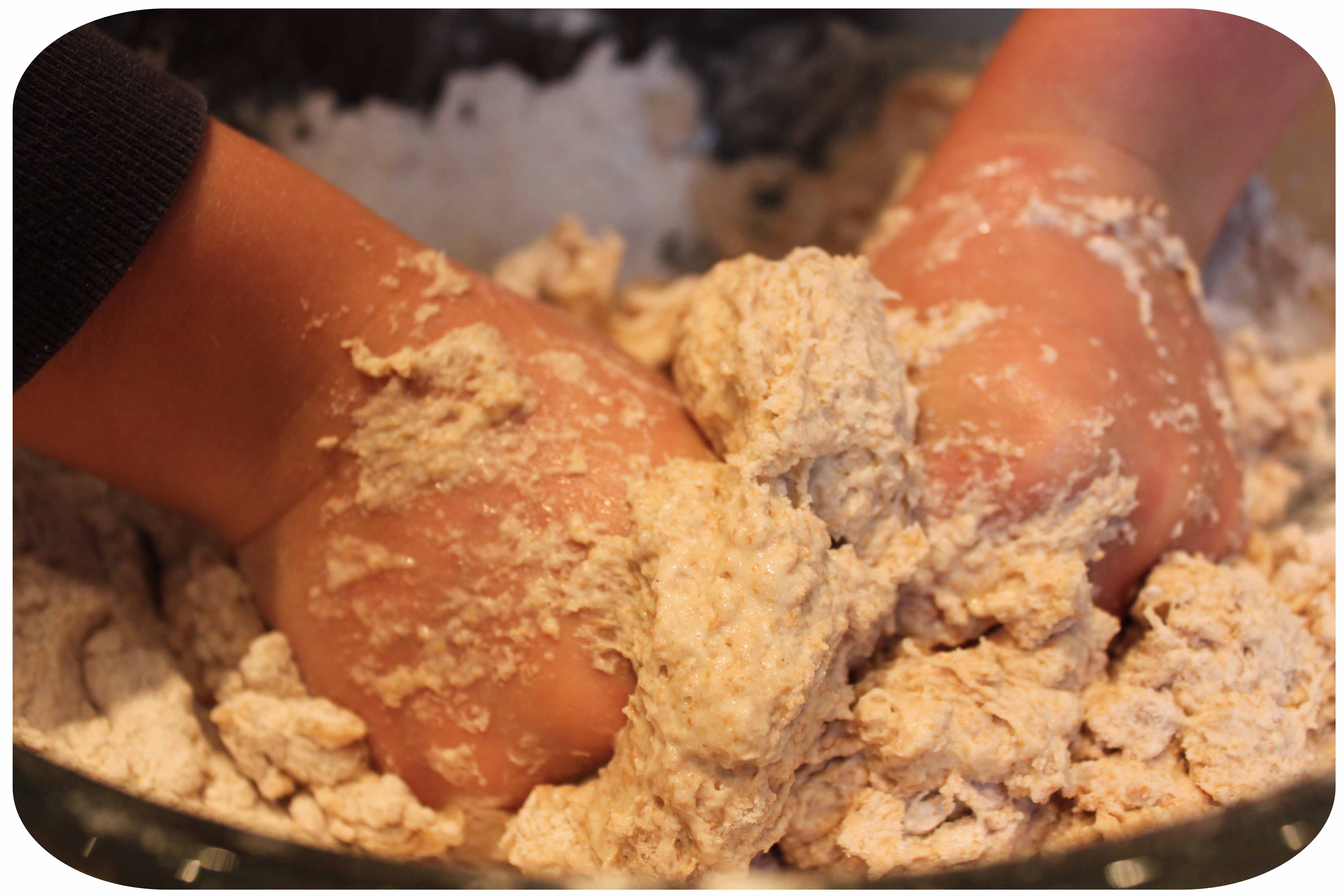 The dry ingredients (flours, salt and dried yeast) were mixed together, by little hands.