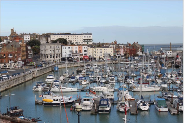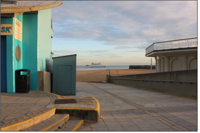 Ramsgate’s main beach is sandy and is known as the “Main Sands”. Looking out to the Main Sands from the old casino you can see one of the cross Channel ferries arriving from Oostende.