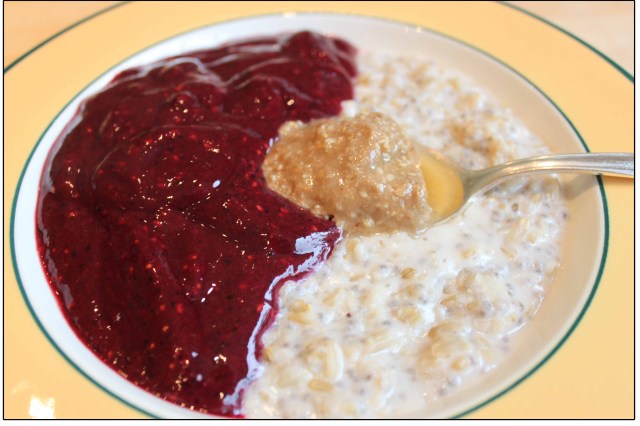 I had breakfast at home. My Weight Watchers points are gradually decreasing as I lose weight so I decided today was the day to reduce my porridge portion from half a cup to a third of a cup. I made it with 140 ml almond milk and 1 tsp Chia seeds. I added some berries, which I had pureed with 2 fresh figs and also a tbsp of hazelnut butter for protein and fat. Yummy.