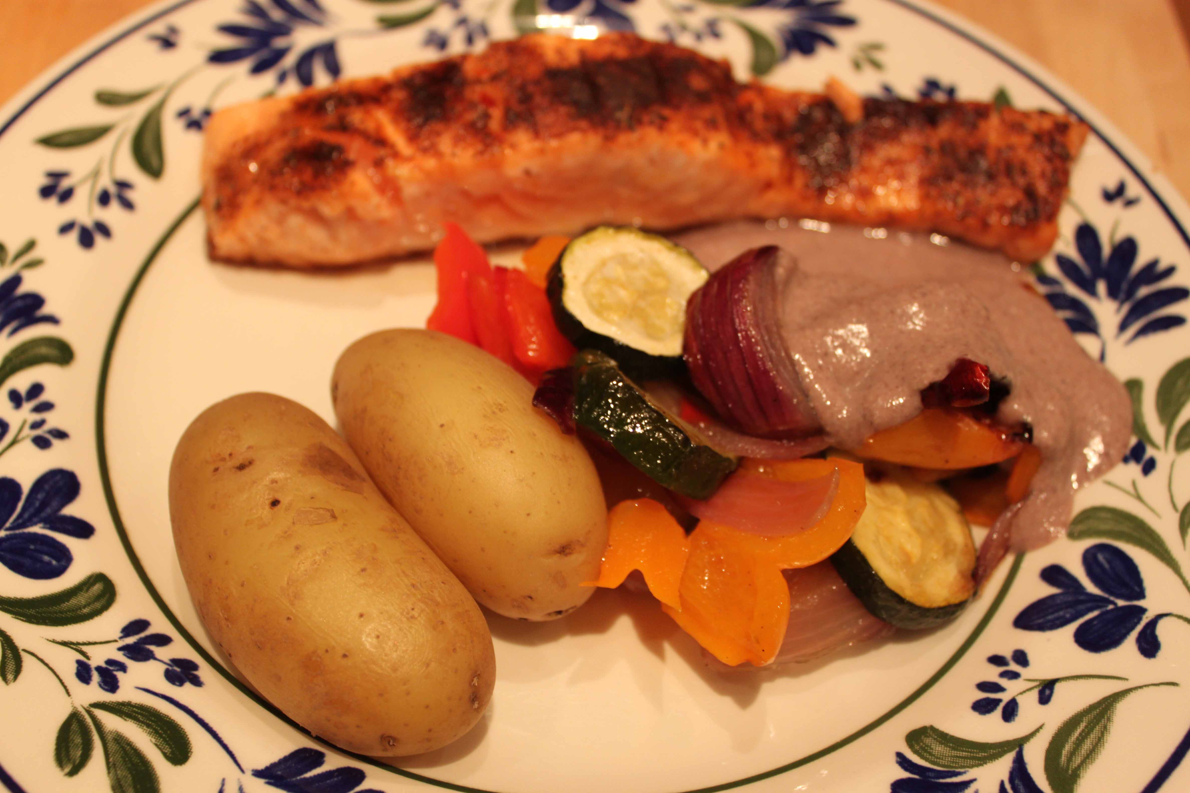 I provided salmon with roasted veg, new potatoes and coconut and black bean dip.