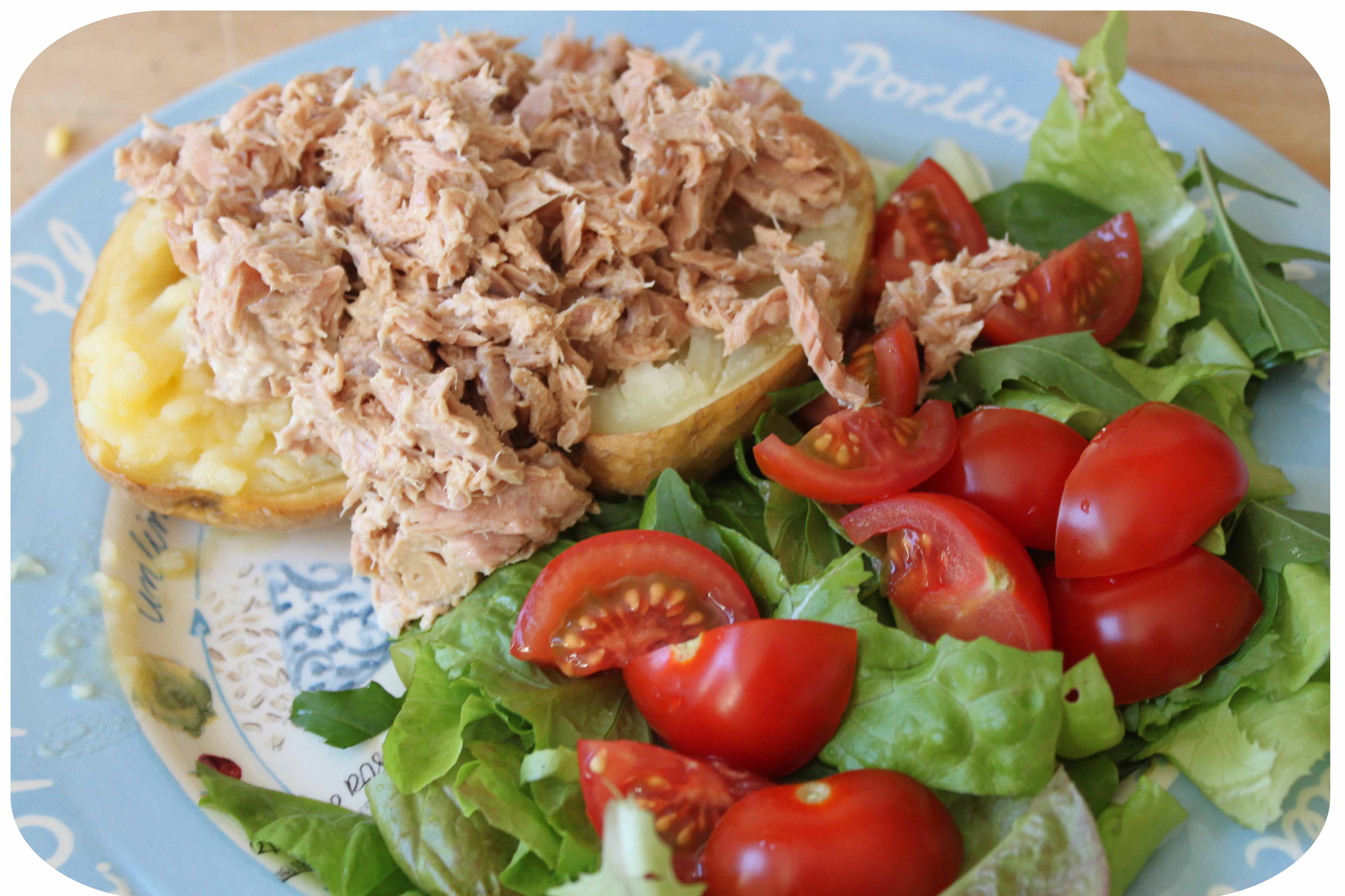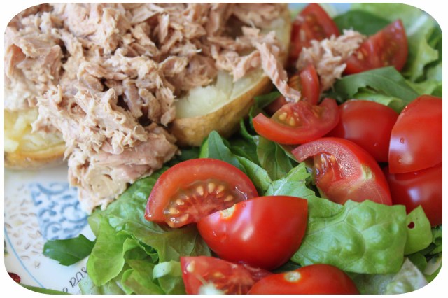 I had a busy morning so lunch was rather unimaginative.  I popped potatoes in the oven so we could have jacket potatoes.  Jacket Potatoes always seem like an Autumn and Winter thing to eat because in the summer we tend to eat new potatoes which are not so good for baking.  The boys had sausages and although I bought good quality sausages (and I love sausages) I decided to resist them and have something lower fat.  I had tuna, with a level tbsp mayonnaise with lettuces, rocket and spinach from the garden and tomatoes.  I put 1 tsp butter on one potato half and had about 15 g Salad cream on the side.  This was a very high point lunch!  The potato and tuna were 8 points each and the meal total was 21 points !!!!  Just half a potato next time I think.