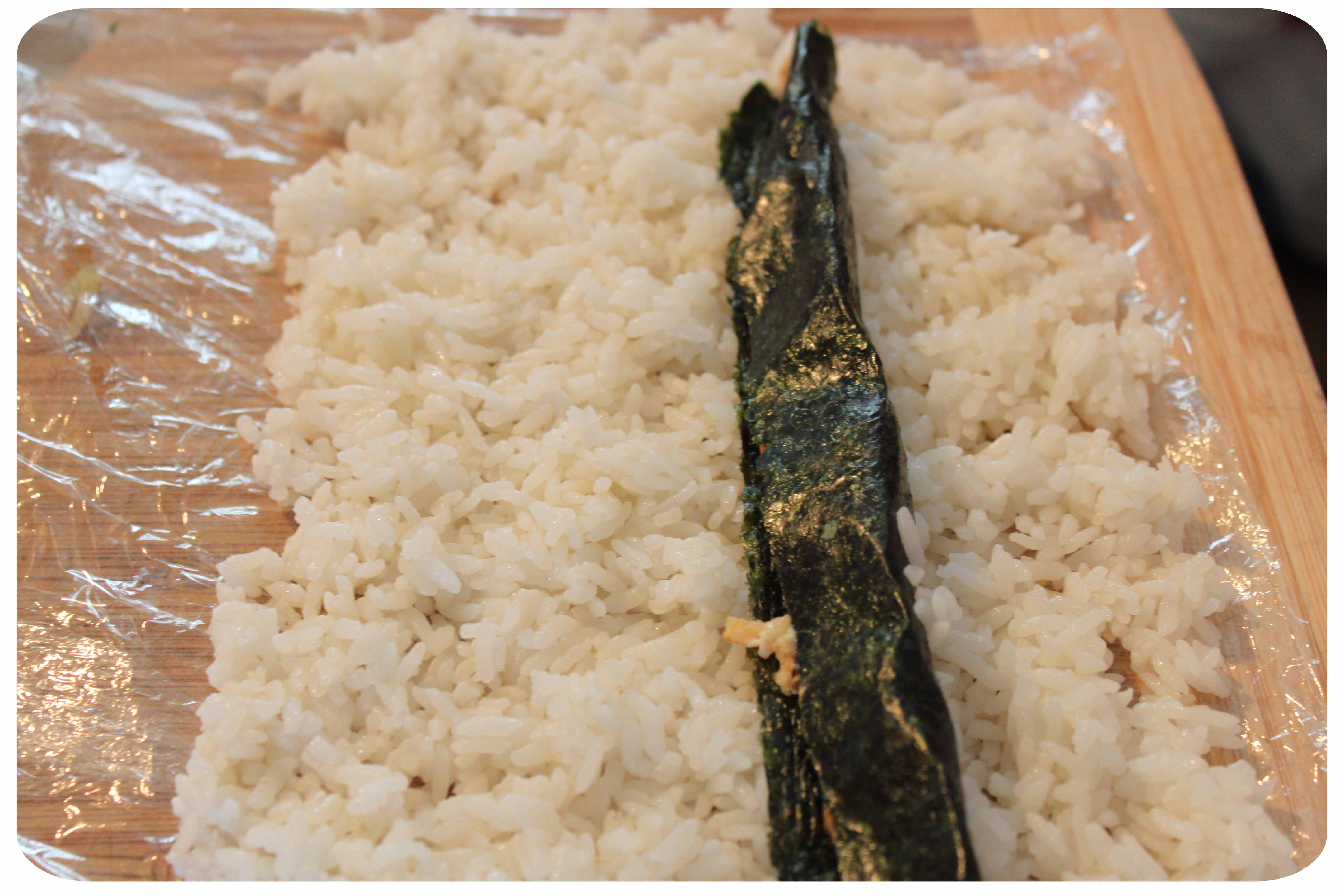 2. Spread the sushi rice over the seaweed, leaving a 2cm gap along the top for sealing the rolled up sushi roll.
