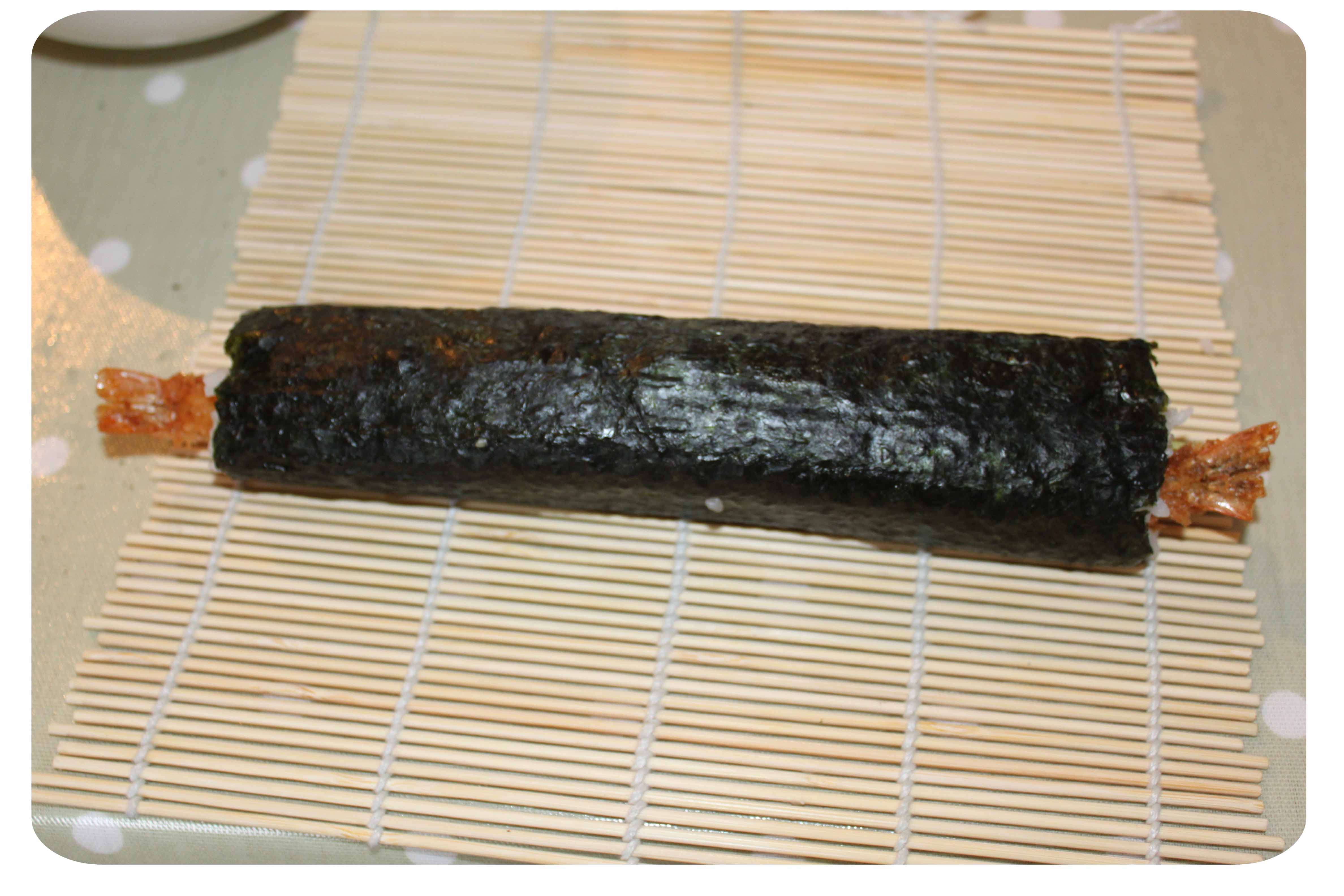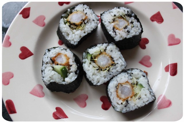 Is it a Christmas cracker?  No, it’s my prawn torpedo with cucumber and  black sesame seed sushi roll.