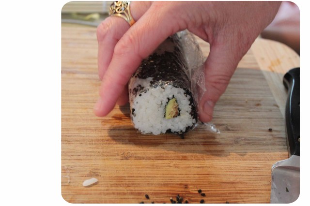 3. Lay your filling across the rice about a third up from the bottom.  Jenni added cucumber and black sesame seeds.  Then roll, dampening the top of the sea weed sheet so it seals the roll and squeezing with the mat so it is firm.  Then cut in half with a wet knife and then in to rounds (about 6-8 from each roll).