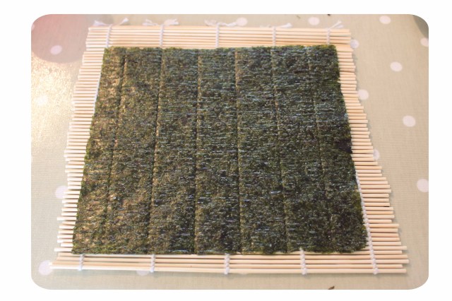 1. Lay the seaweed sheet, rough side facing up, on a rolling mat.