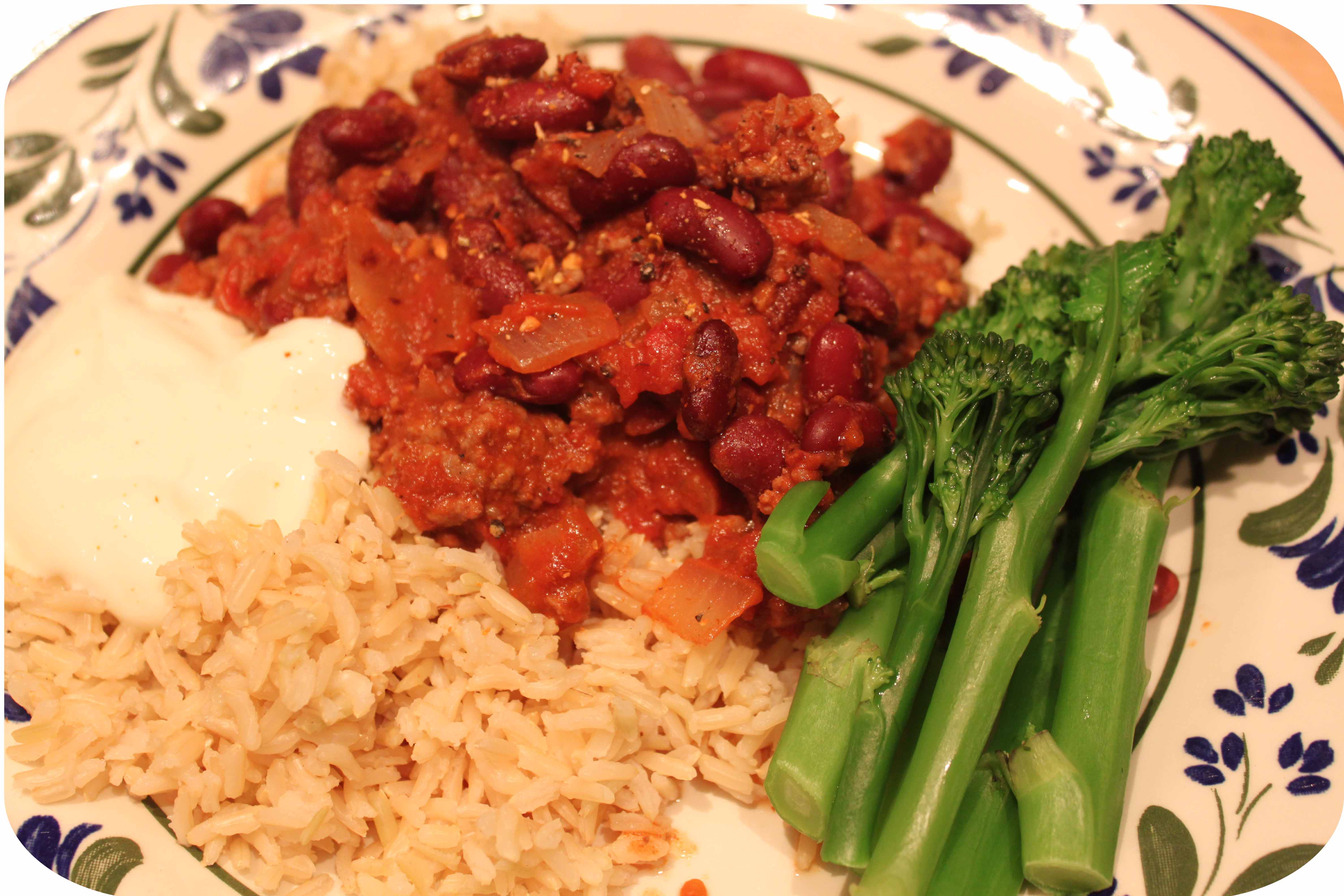 I added a can of red kidney beans and 1 tsp of sweet smoked paprika. So I probably had 50 g beef mince, 1/3 of a can of red kidney beans which I served with 100 g cooked brown basmati rice, a large tbsp half fat soured cream and broccoli. I grated some dried chili on my meat to give it some heat. It tasted really good and I was hungry by the evening so enjoyed a substantial meal.
