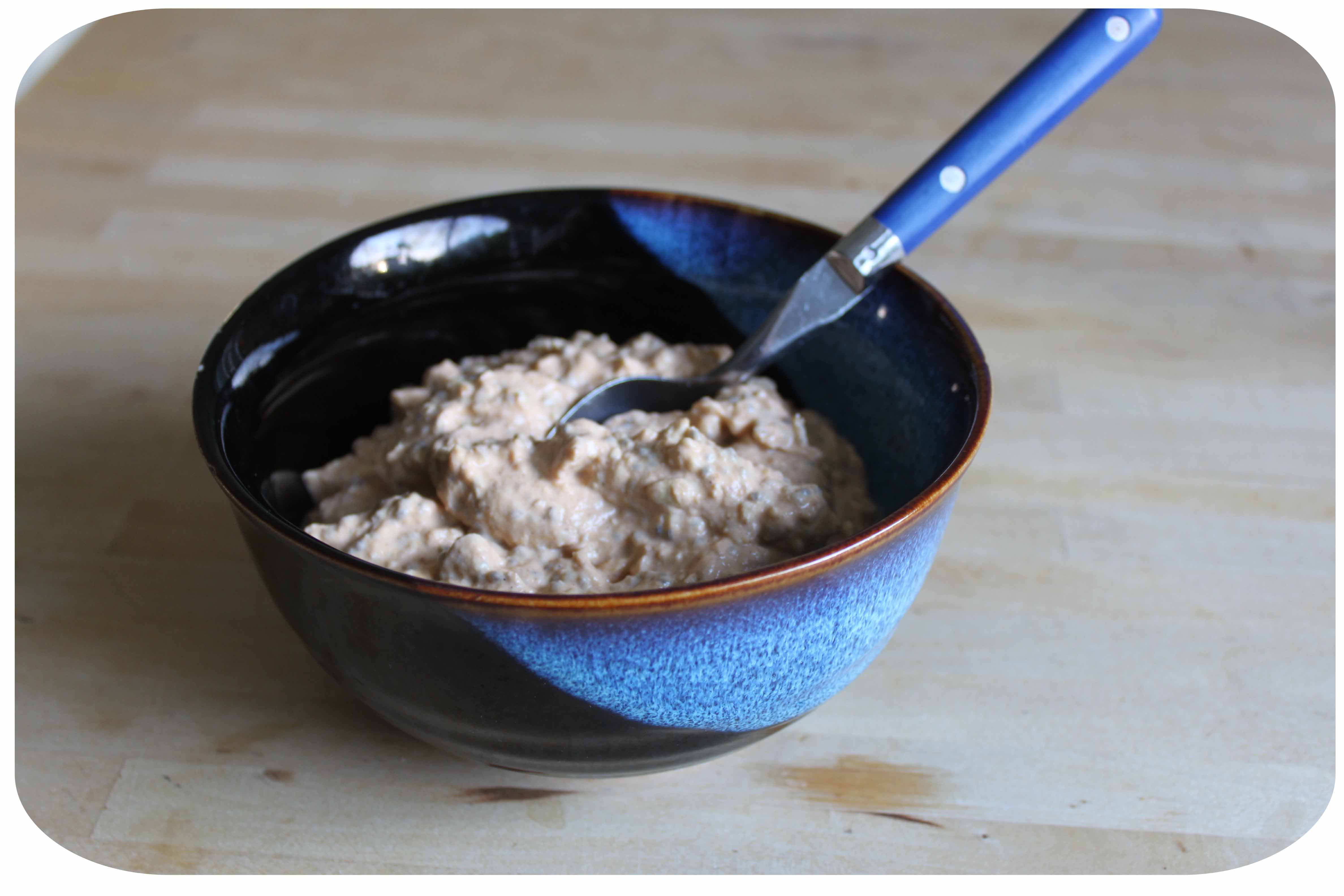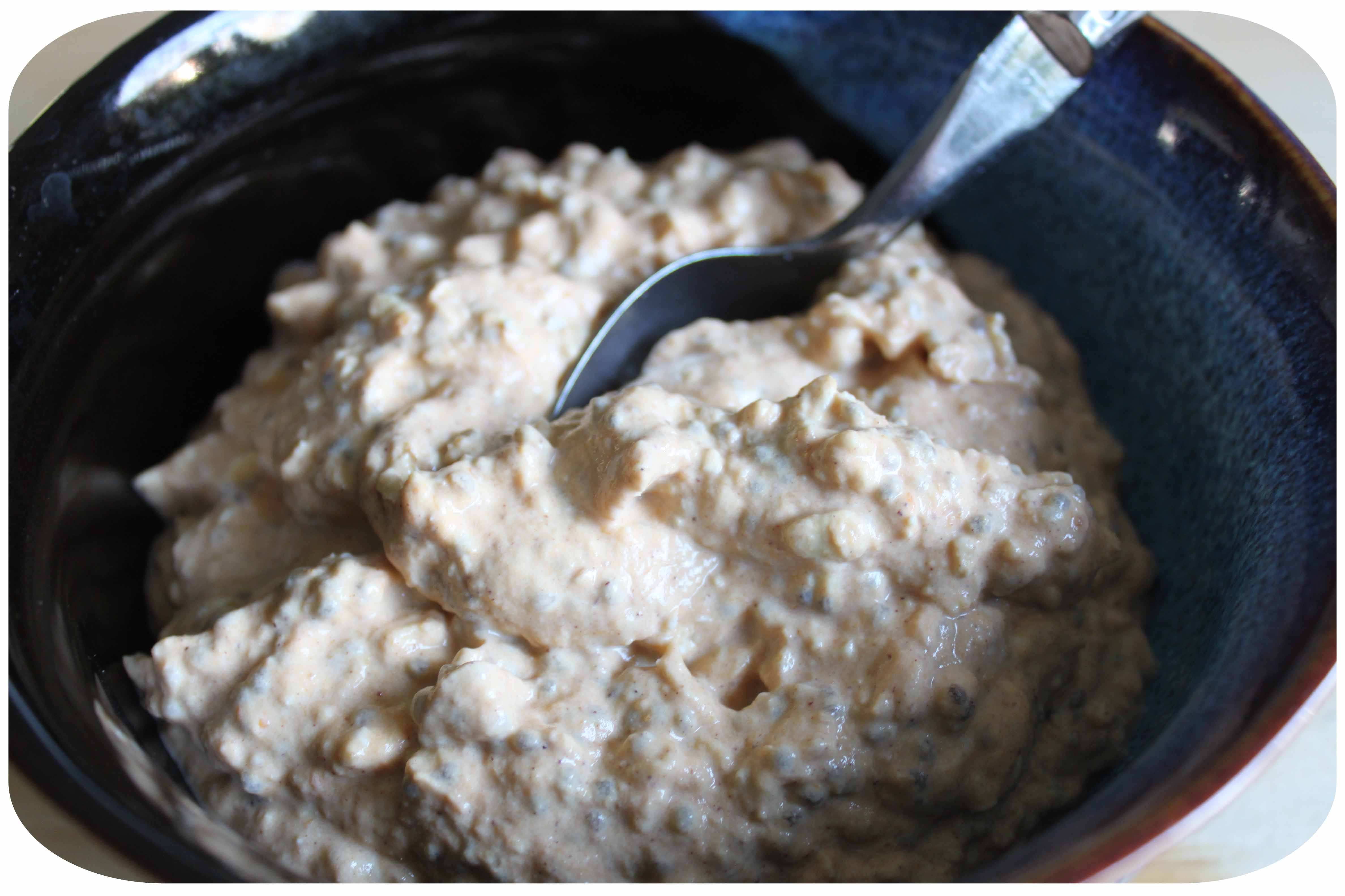 I had prepared breakfast the previous evening so it could soften up overnight in a similar way to a Bircher muesli. I mixed together 1/2 a cup of oats with the same quantity of almond milk, Greek yogurt and pumpkin puree. I then added 1 tbsp of Chia seeds, 1/2 a tsp cinnamon and 1/2 tsp pumpkin pie seasoning. I left this on the side (i.e. not in the fridge) overnight. All I had to do this morning was eat it and it was lovely.