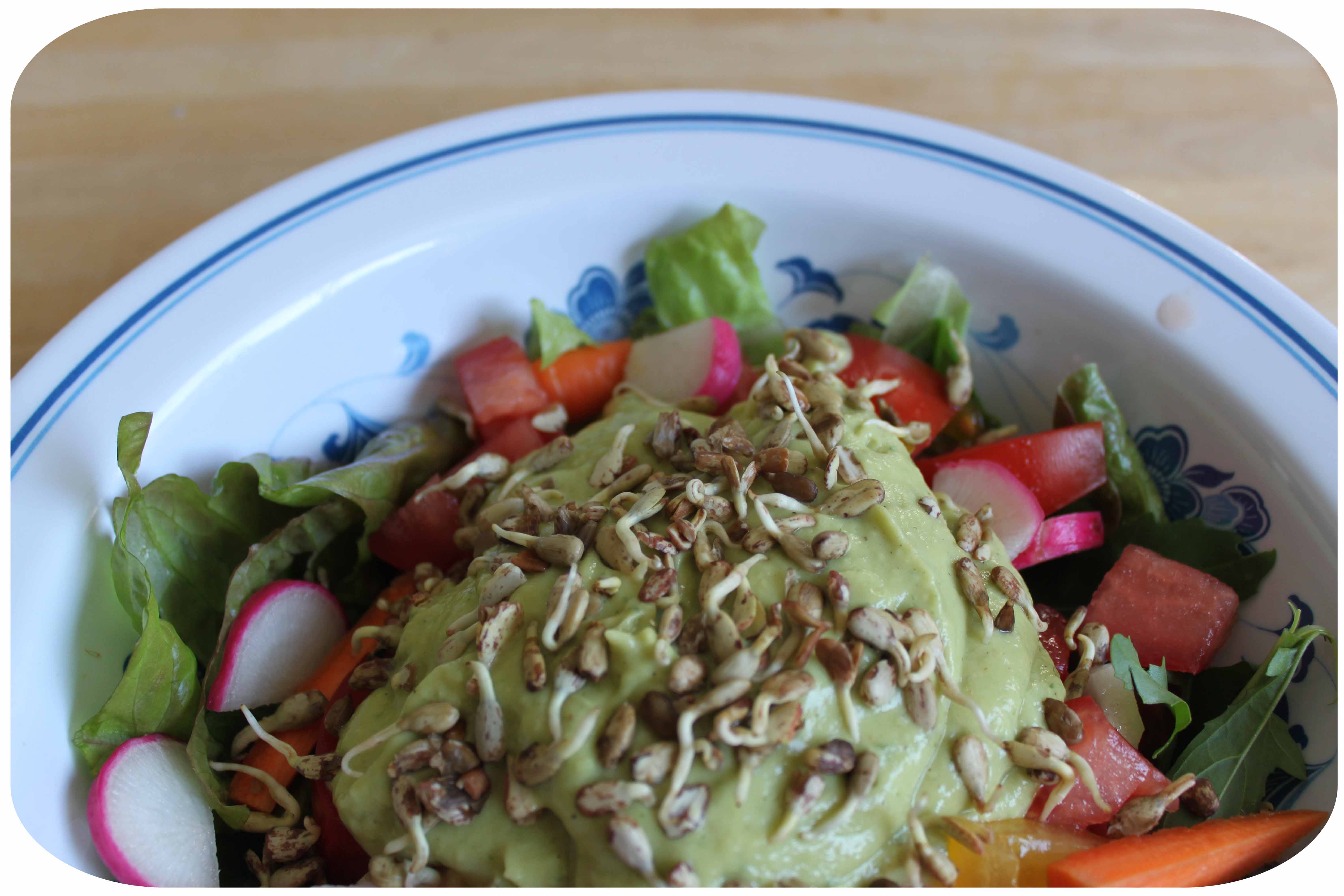 To go on the salad I made an avocado dressing which I found on a blog I read regularly; Live Avocado Goddess Sauce from Peas and Thank You.
