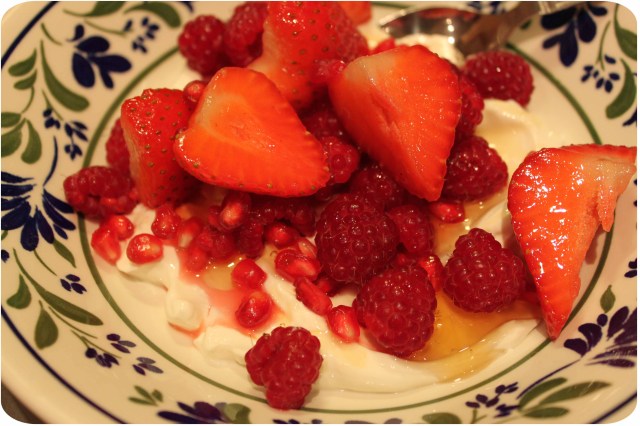 Topped with strawberries, raspberries and pomegranate. Delicious.
