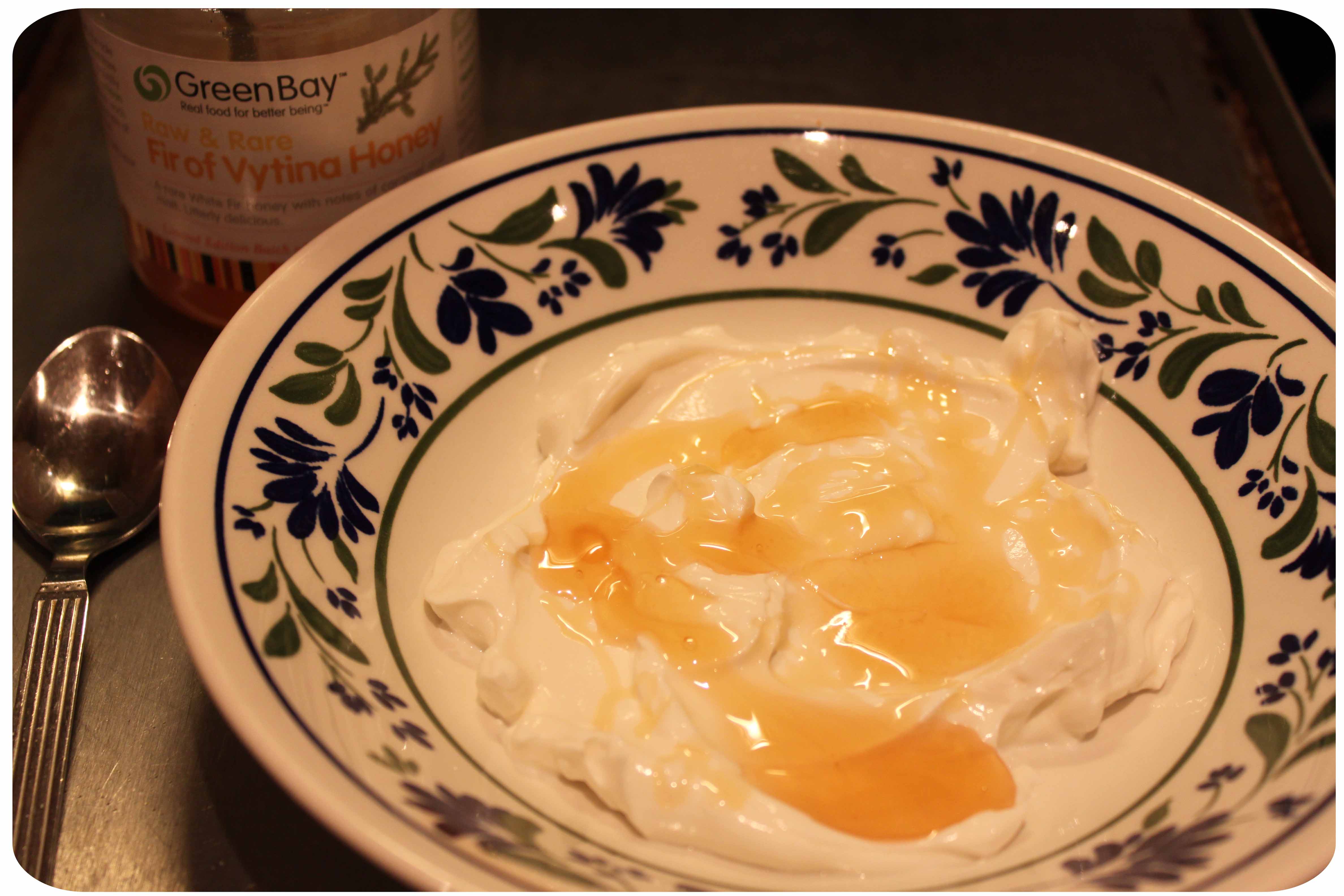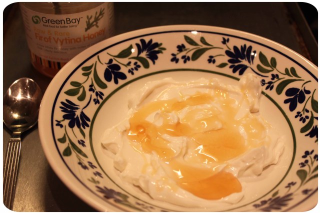 Followed by 100 g Greek yogurt with 1 tsp honey. The honey is a raw one by Green Bay called ‘Raw and Rare Fir of Vytina’ and tastes divine.