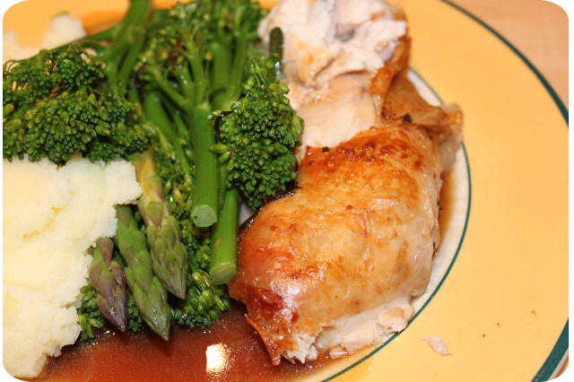 Dinner was roast chicken, mashed potato (wonder who fancied some comfort food!), broccoli and asparagus with gravy.