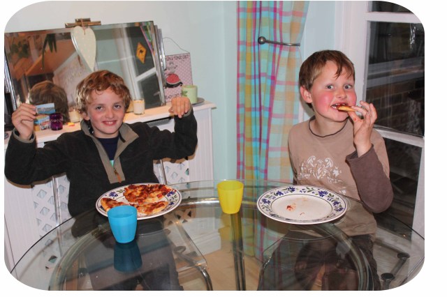 There is a factory in my garden that keeps producing lovely boys and instructing them to come and sit at my kitchen table and eat my food. This evening we have the Lucas version and they ate pizza which they chose earlier when I popped in to the shops with them.