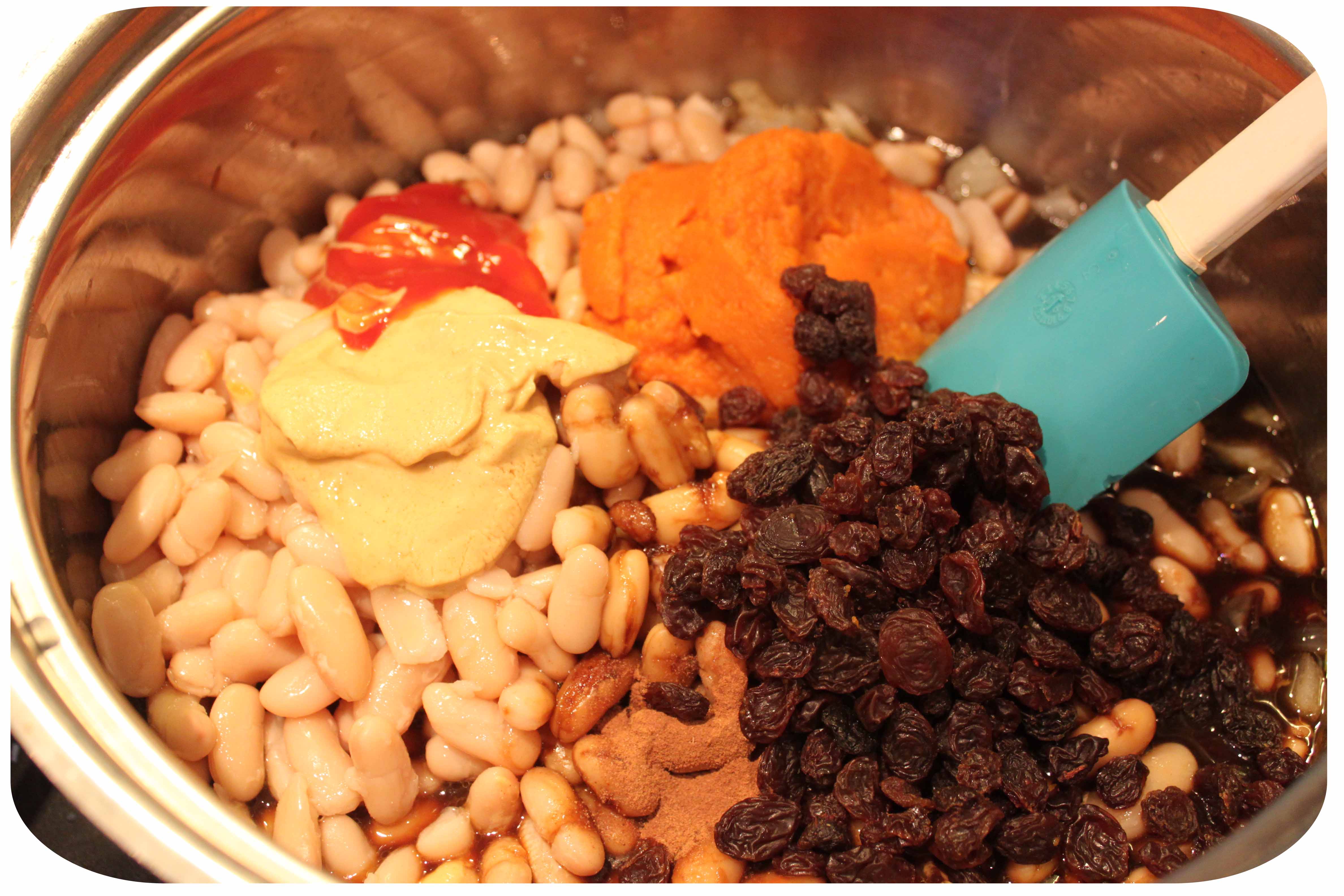 I decided to cook an American supper as it is nearly Halloween. From a blog I have recently discovered and am enjoying, ‘ Oh She Glows ‘, comes this recipe for “Pumpkin Maple Baked Bean Cornbread Casserole”. That doesn’t trip off the tongue very easily. I think I will refer to it as “sweet bean casserole with cornbread topping” in future. The haricot beans are mixed with pumpkin, raisins, blackstrap molasses, maple syrup and various other condiments.