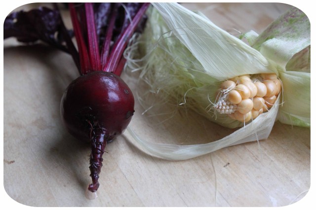 In the morning I had cleared my vegetable patch of the last of its produce. My sweetcorn was a massive fail this year and this tragic little specimen was all I managed to grow. I decided it was worth eating though and added it to the pile of things to use up for lunch. I was pleased to find a beetroot among the weeds in the veggie bed and will roast that in the week.