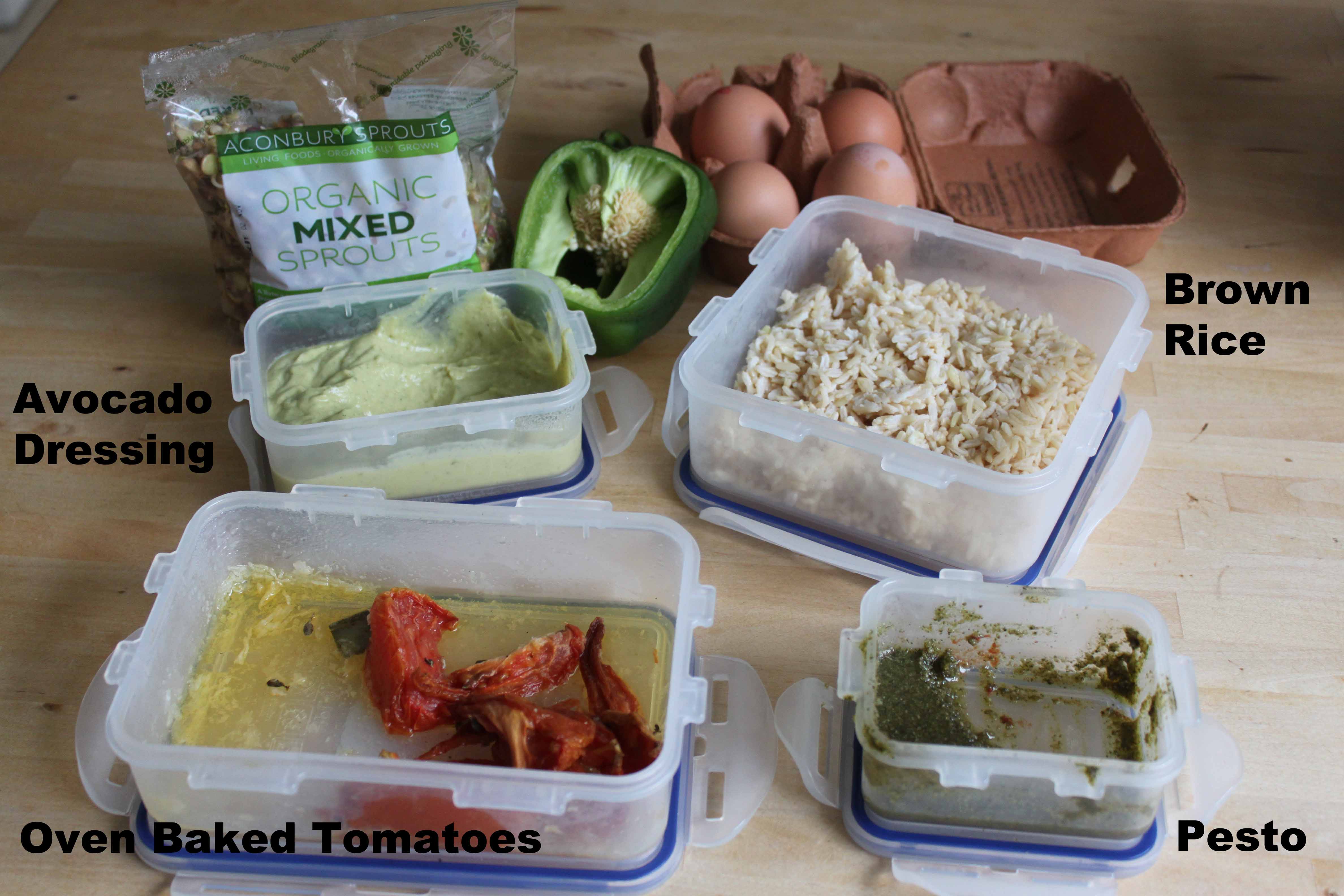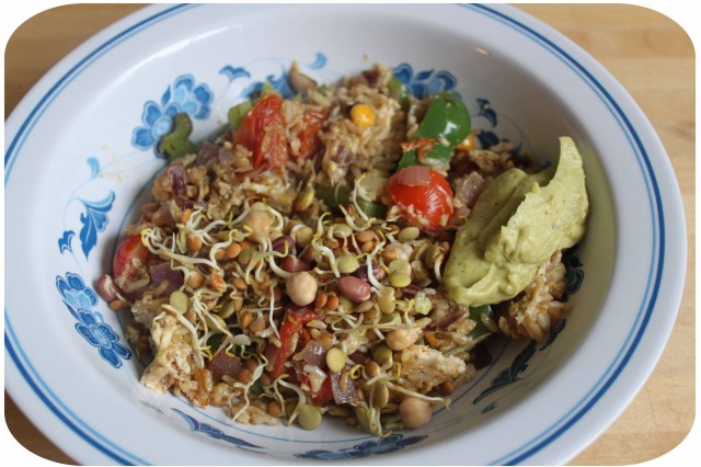 And made egg fried rice with fresh vegetables, with mixed sprouted seeds sprinkled on top and served with a large dollop of avocado dressing. Lovely.