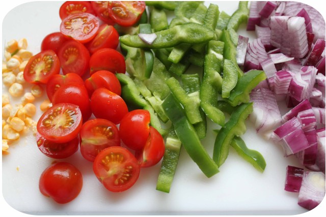 I added some fresh cherry tomatoes and red onion to the green pepper and sweetcorn.