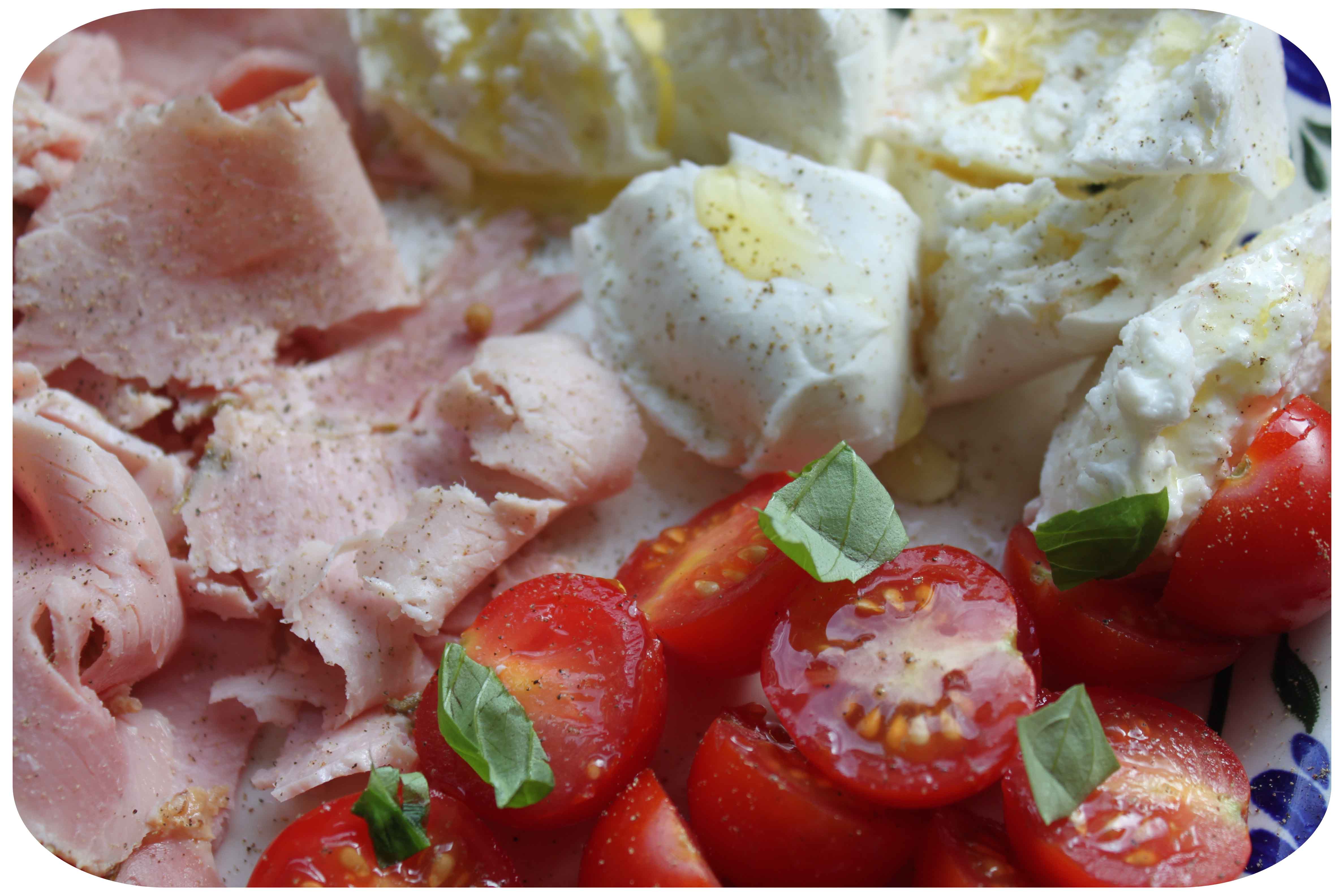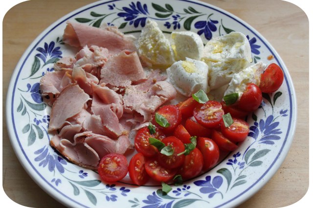 I put the ham (72 g) and Mozarella (99 g) on a plate with some cherry tomatoes, basil, fresh ground black pepper and a drizzle of olive oil.