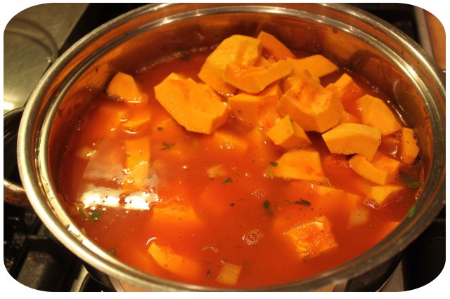 4. Peel and deseed the squash and cut in to cubes.  Add to pan with the stock.