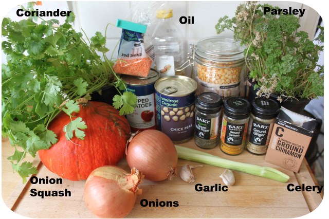 I decided to make supper before I went out for lunch so I assembled the ingredients for one of the recipes from ‘ Veg everyday! ‘; North African Squash with Chickpeas.
