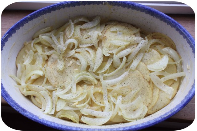 There were 13 for lunch today and an easy potato recipe for a large group, and one that will sit quite happily keeping warm, is Potatoes Boulangere. So named because villagers used to take their dishes full of potatoes in a stock to the bakery and put them in the bread ovens once the bread was baked for the day but the ovens remained warm. They are a healthier alternative to the decadent Potatoes Dauphinoise which are cooked in cream.