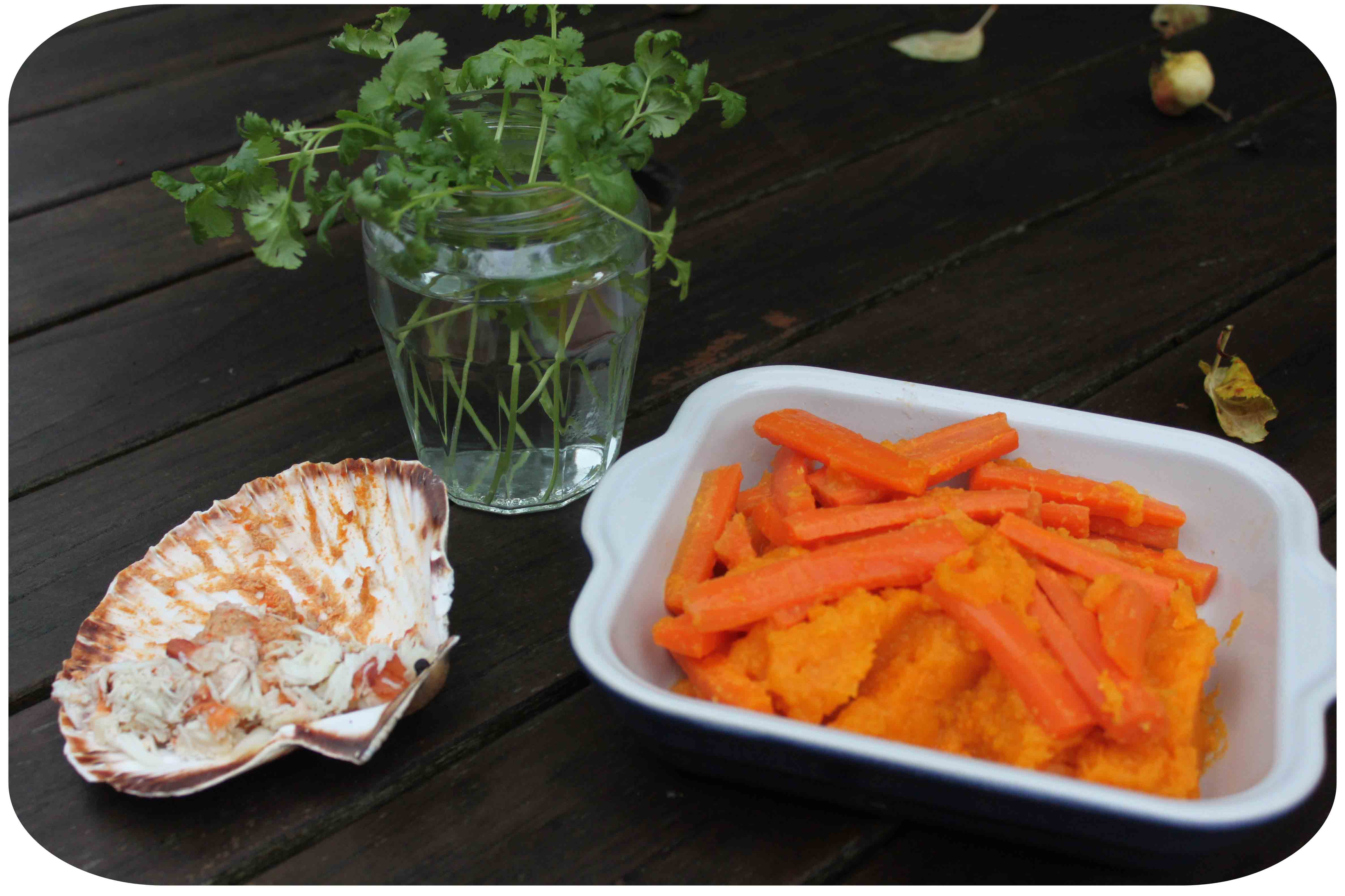 Lunch was bit of a ‘Ready, Steady, Cook’ challenge. There was a bowl of mashed squash and carrots in the fridge which I wanted to use up. I had also been thinking earlier that my pot of coriander was beginning to look a bit tragic so I snipped off all the most vibrant green leaves and put them in water to try and perk them up a bit. I also had 1/4 of the dressed crab left over from Friday.