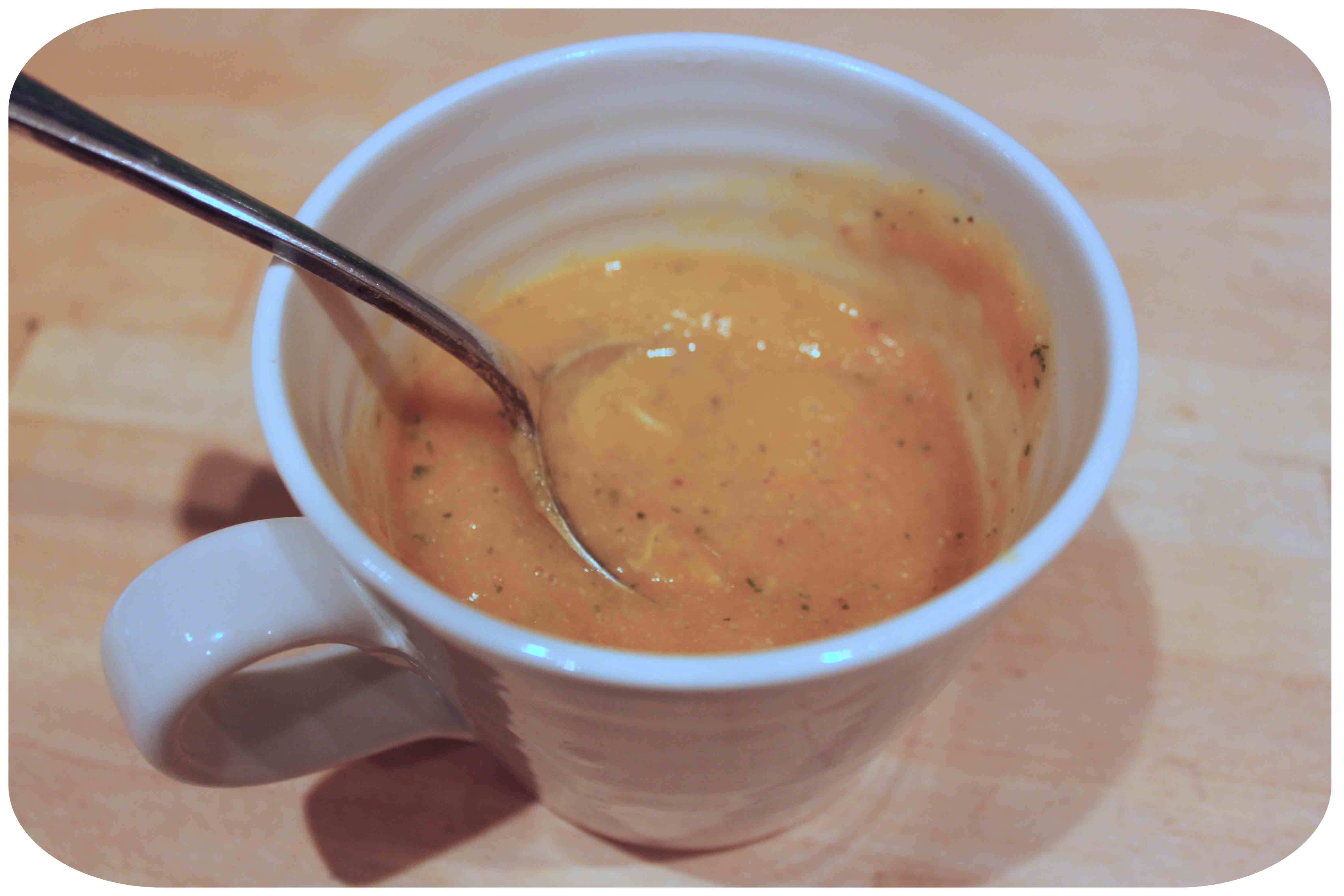 While I was cooking supper, I had a small mug of the little bit of soup left over from lunch, which I contentedly slurped while waiting for the water to boil.