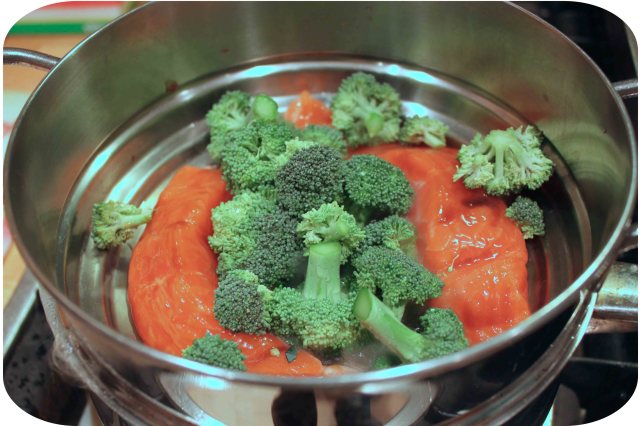 Supper was spaghetti with salmon, broccoli and cherry tomatoes. I put the pasta in the pan and steamed the salmon and broccoli in a steamer above. I brushed some oyster sauce on the salmon while it was cooking.