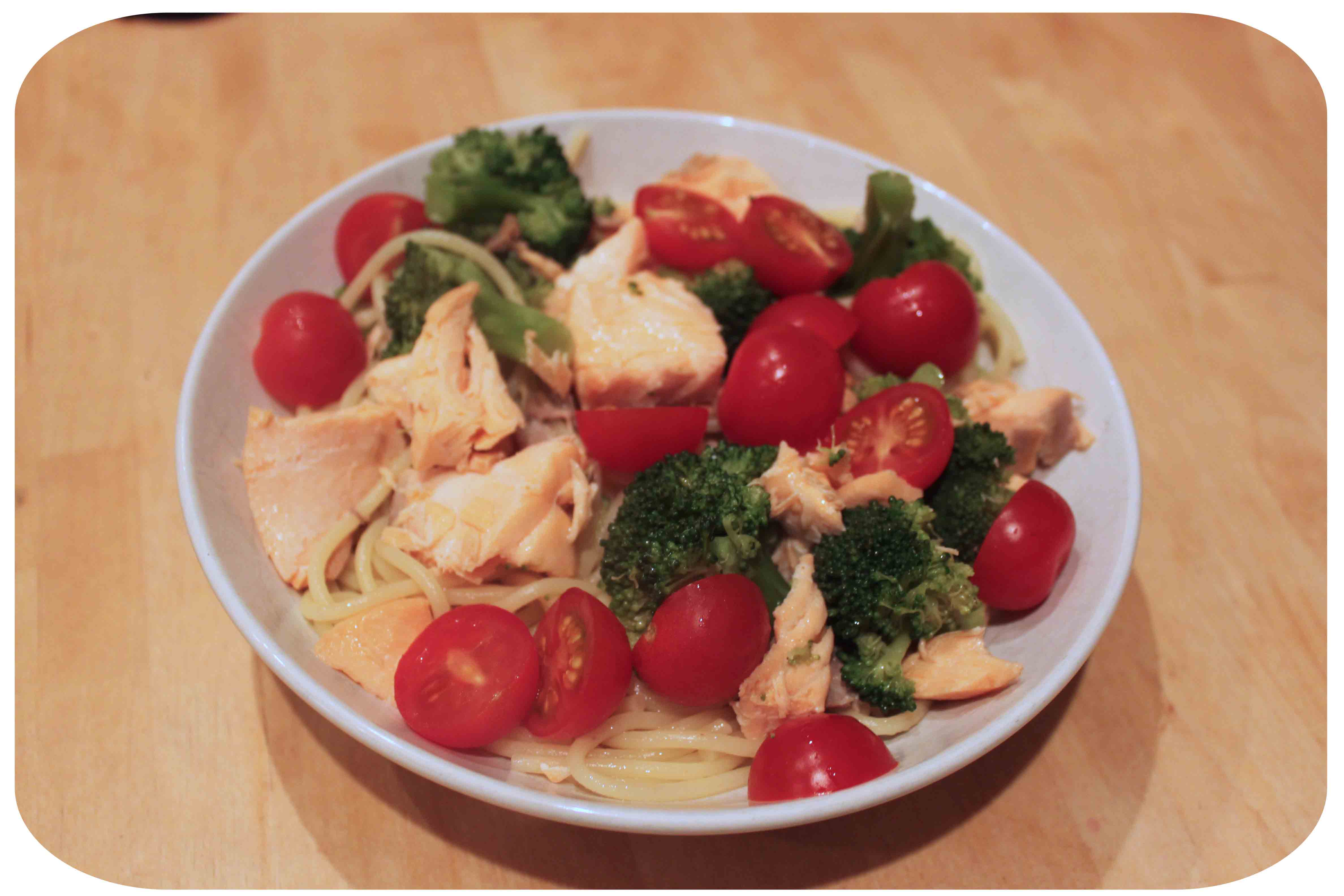 When I had drained the spaghetti, I added some sesame oil and pepper. I flaked the salmon, added the broccoli and the cherry tomatoes. It was a simple supper but tasty and we both enjoyed it.