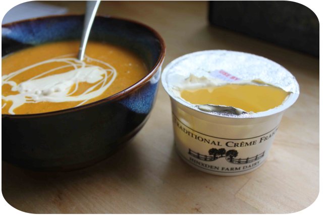 I also had some creme fraiche left over from the weekend from the lovely Hinxden Farm Dairy in Benenden. It is so rich and creamy. Quite divine. So I drizzled some of that in too and it became the most wonderful bowl of soup; full of flavour, sweet and creamy. The crab was barely detectable but it did add a subtle richness. I naturally had seconds as it was actually irresistible.